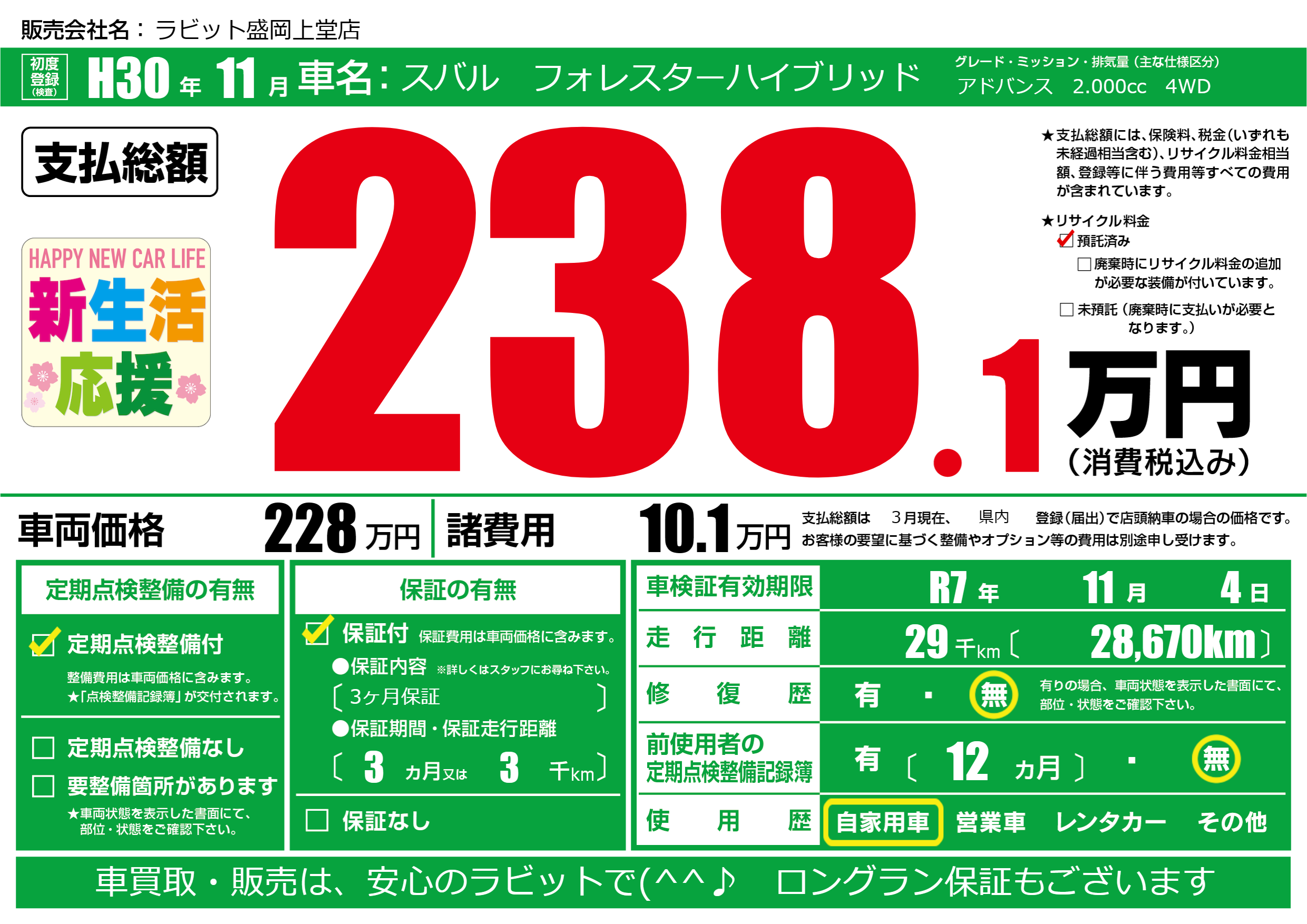| 車名 | スバル フォレスターハイブリッド | グレード ミッション 排気量 |