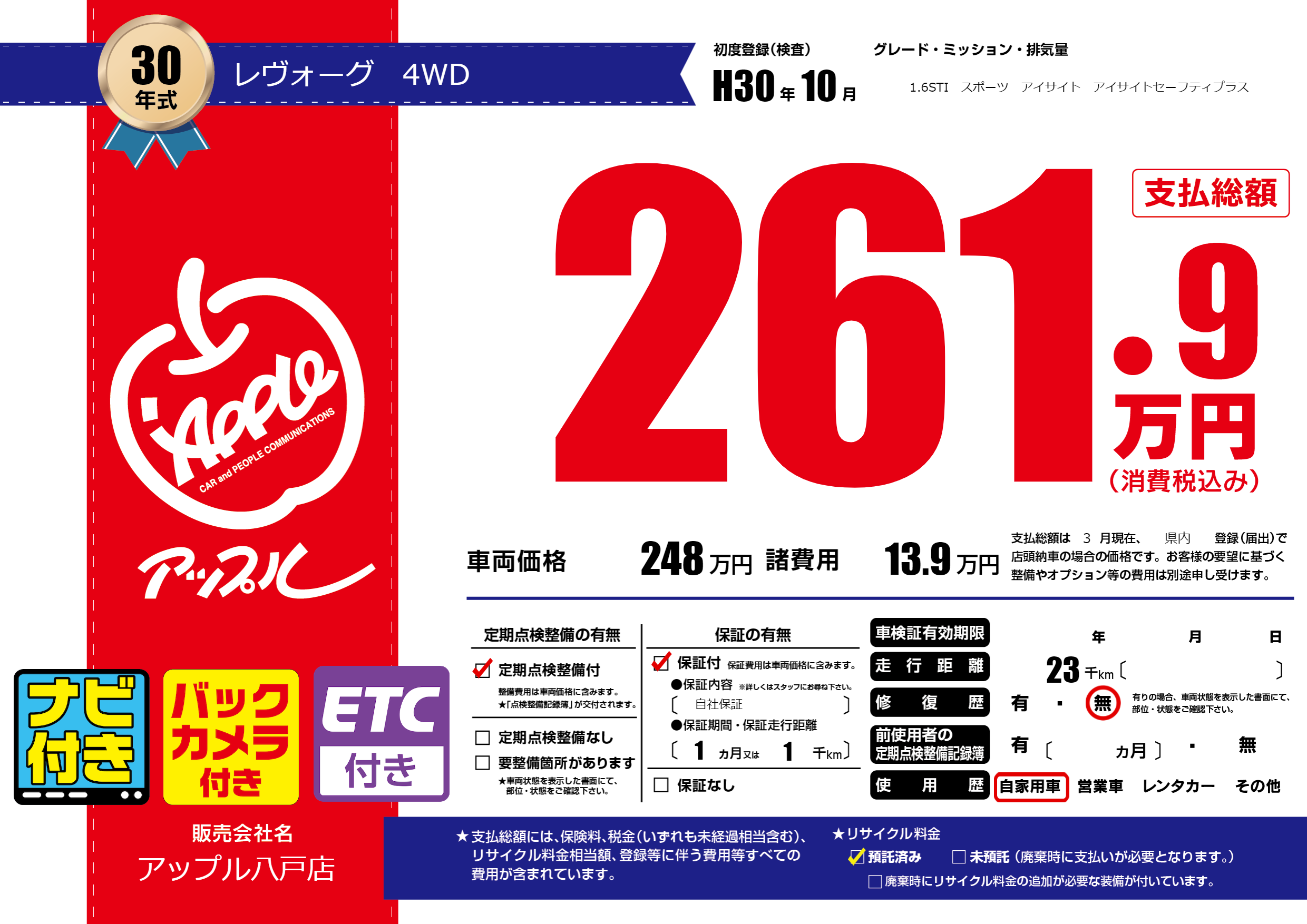 あり | リサイクル預託金相当額 | ( 0円)が別途必要 |