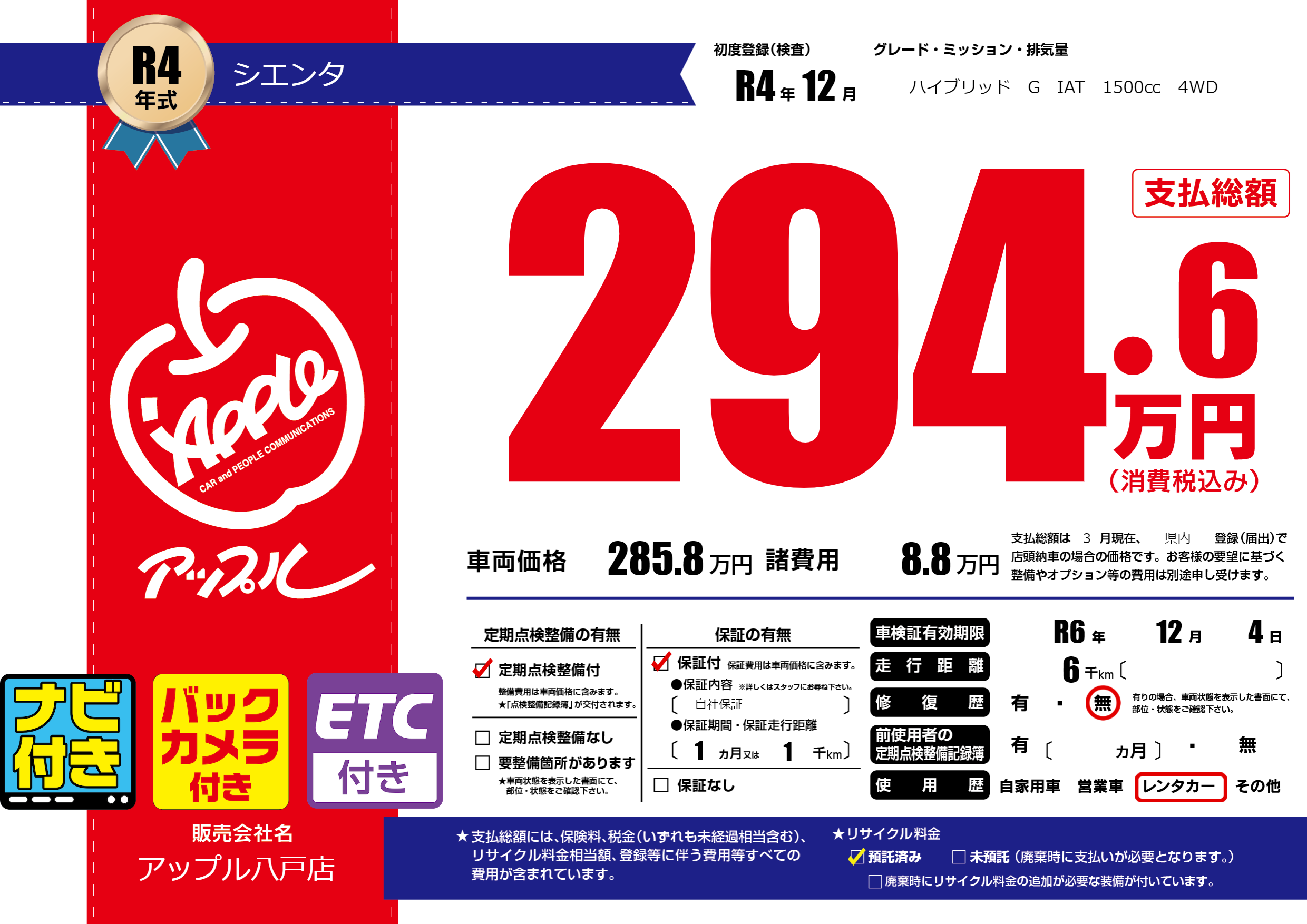 | 車名 | シエンタ | グレード ミッション 排気量 |