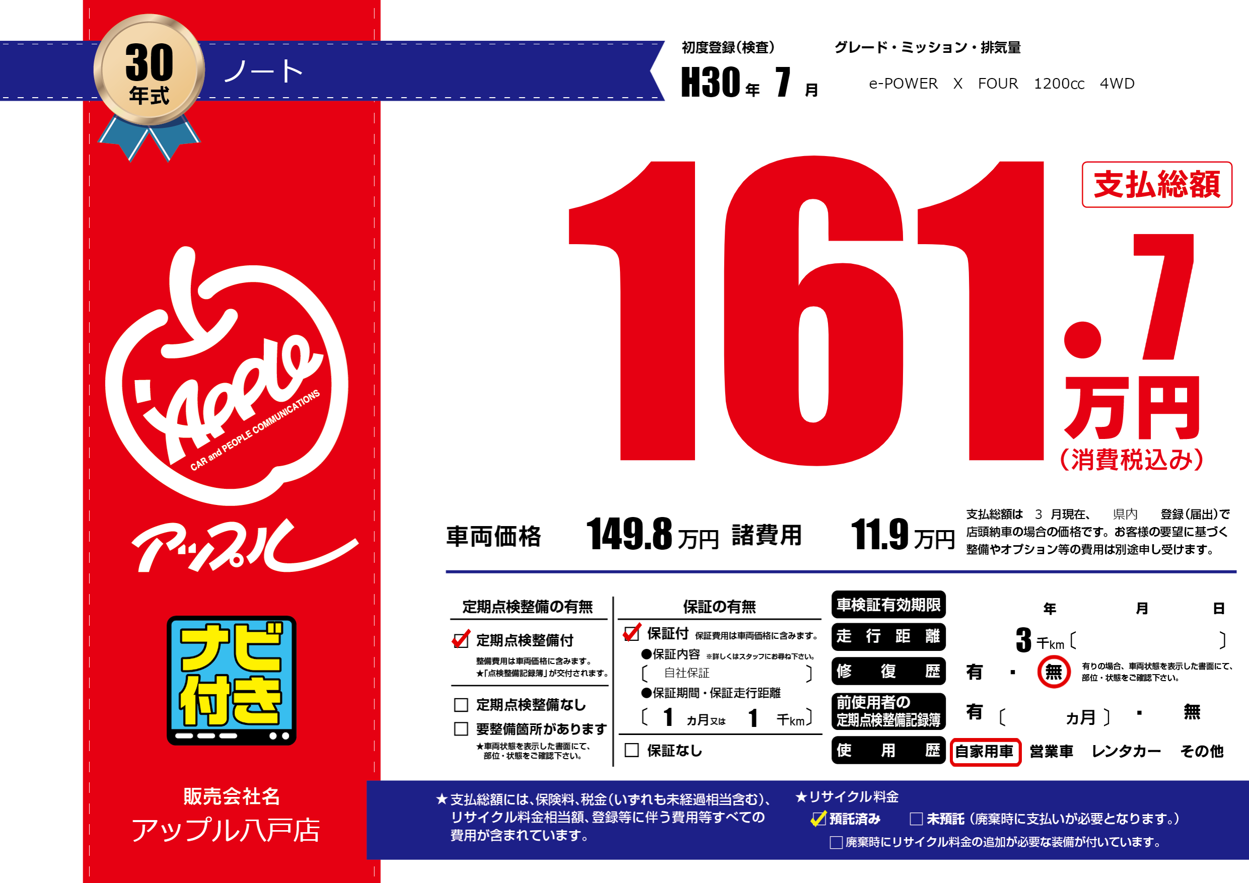 保証付き 保証内容( 自社保証) 1ヶ月または(1)千kmまで |