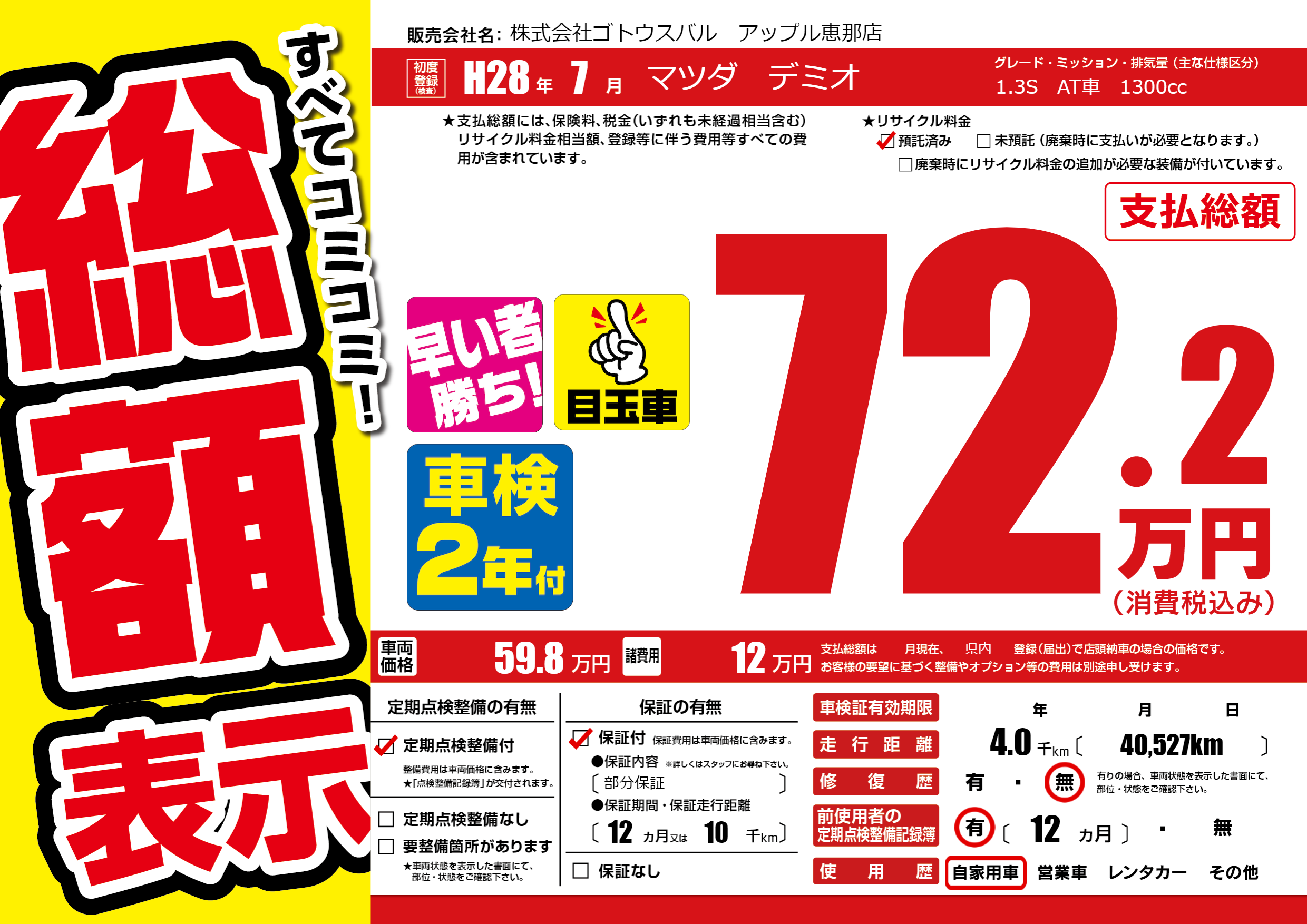 | 車名 | マツダ デミオ | グレード ミッション 排気量 |