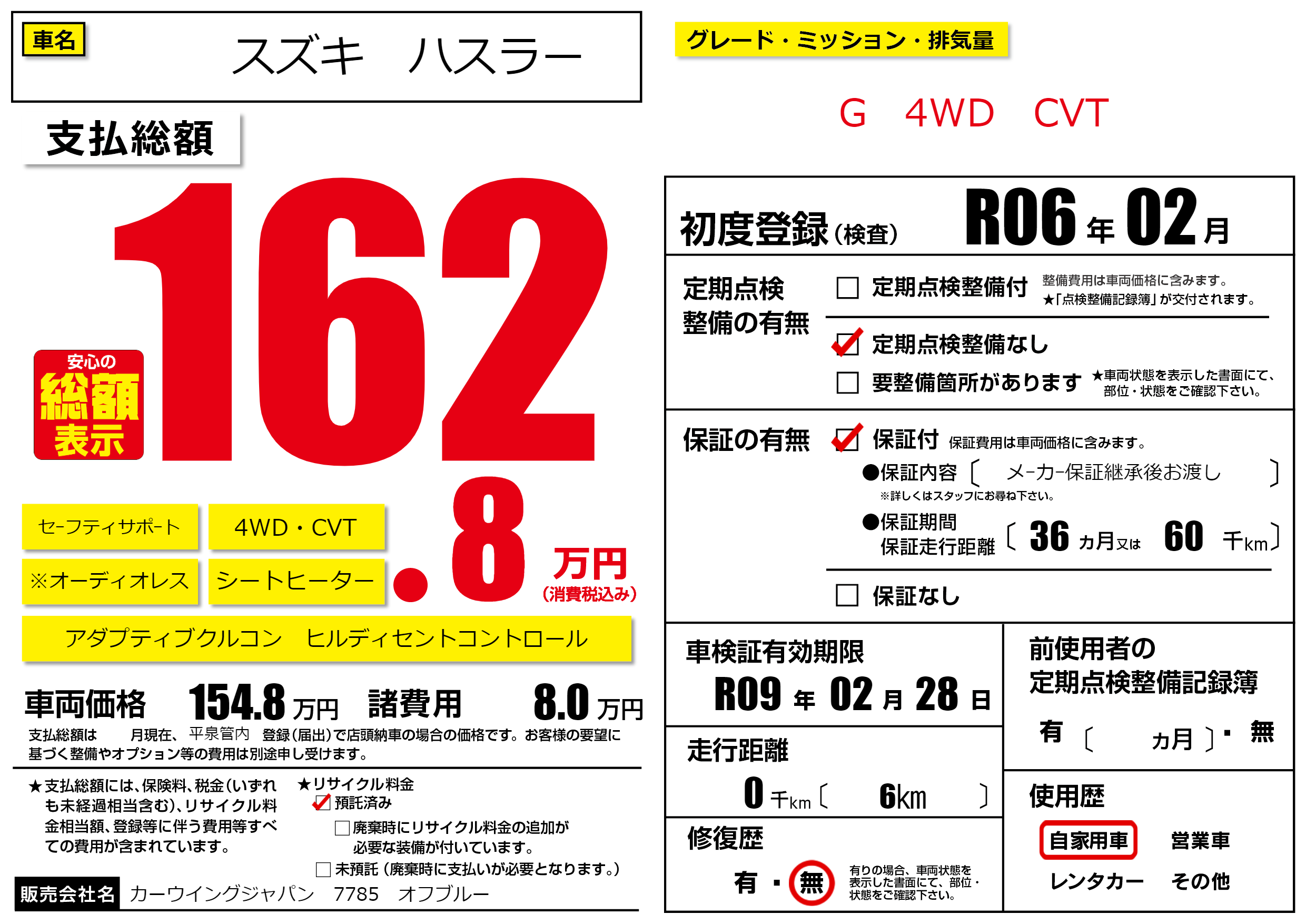 | 車名 | スズキ ハスラー | グレード ミッション 排気量 |