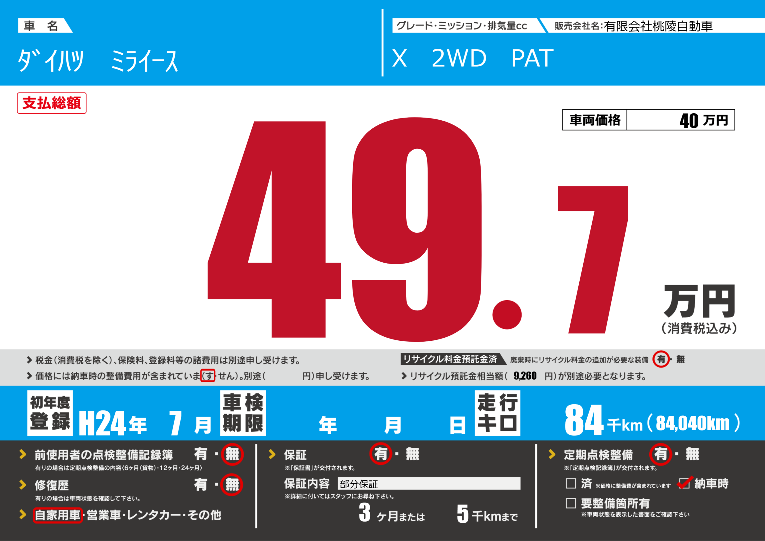 保証付き 保証内容(部分保証) 3ヶ月または(5)千kmまで |