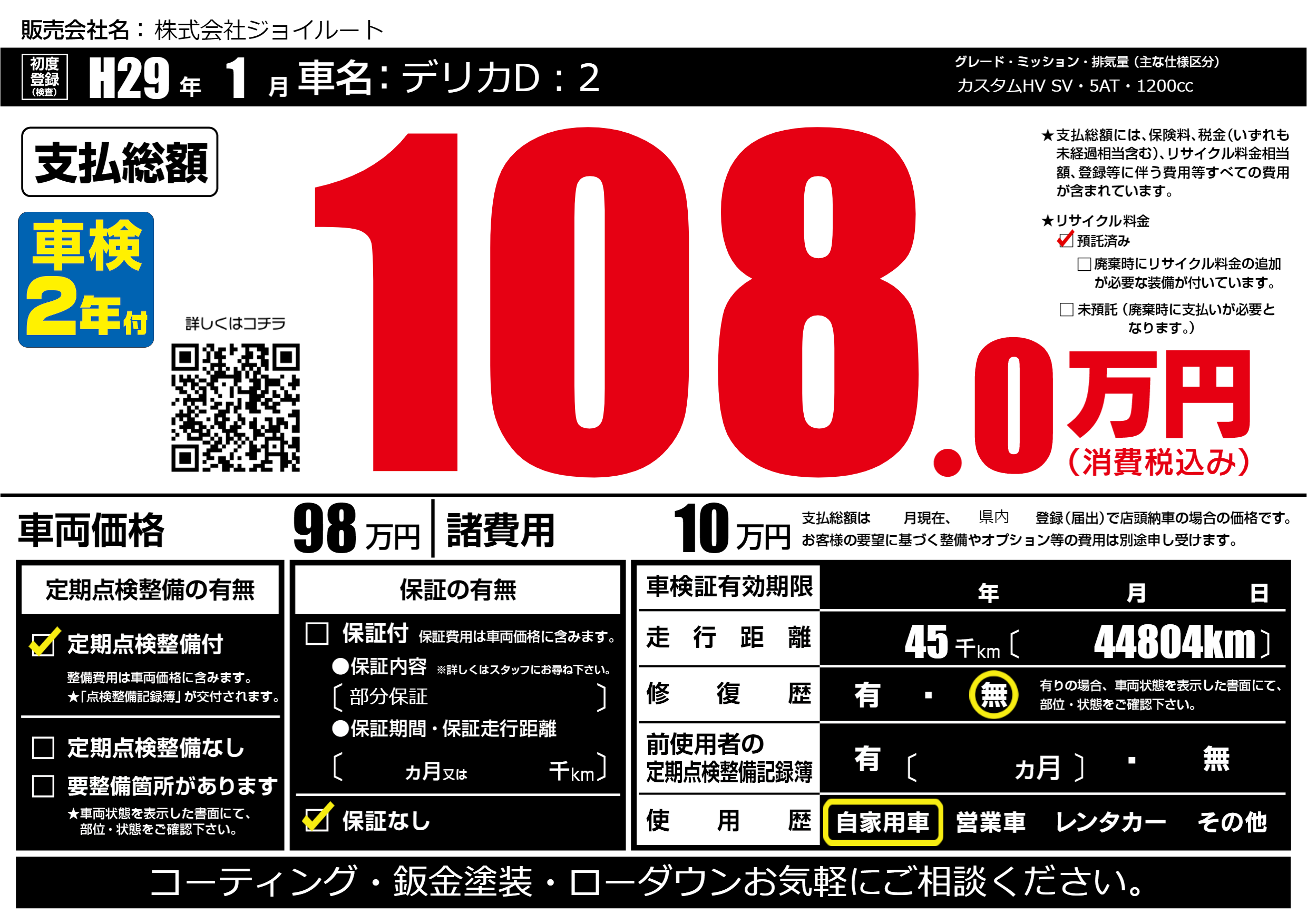 | 車名 | デリカD:2 | グレード ミッション 排気量 |