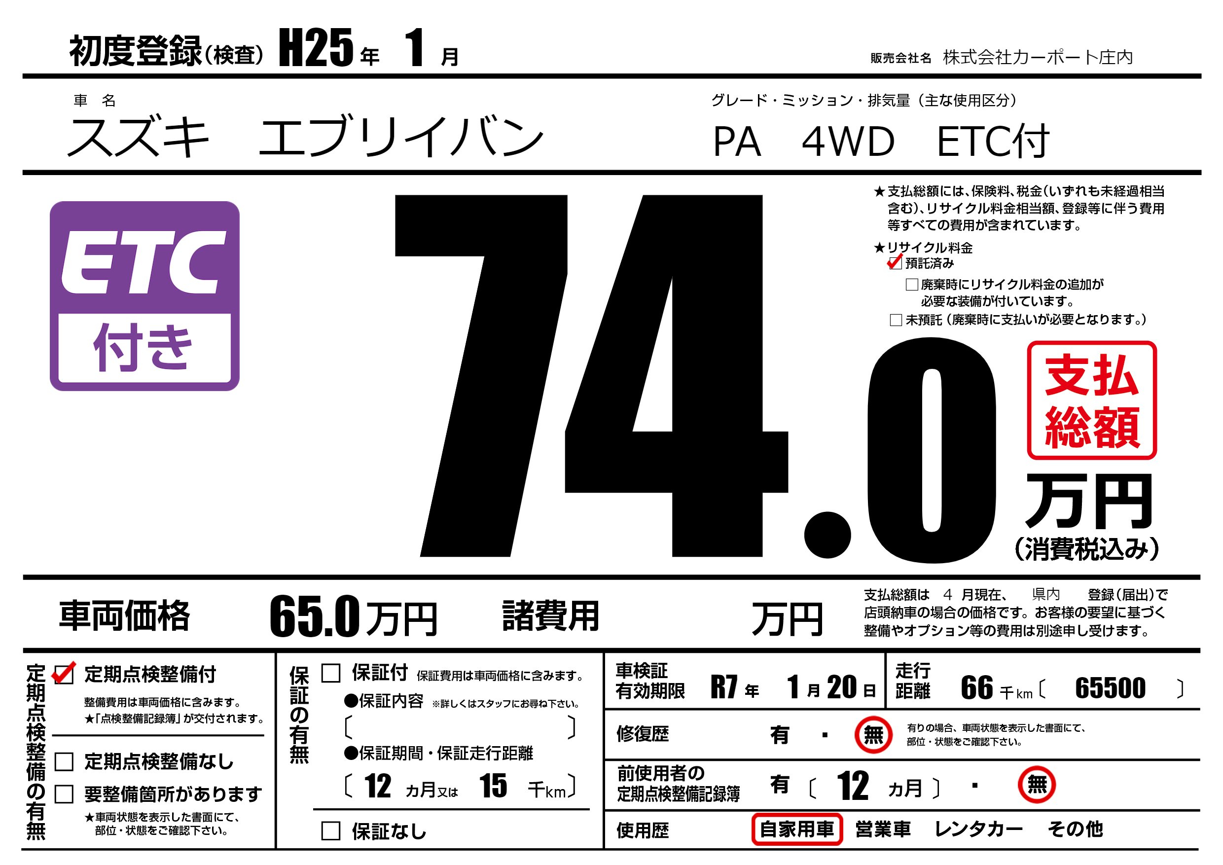 | 走行キロ | 6.6万km | 初年度登録 | H25年1月 |