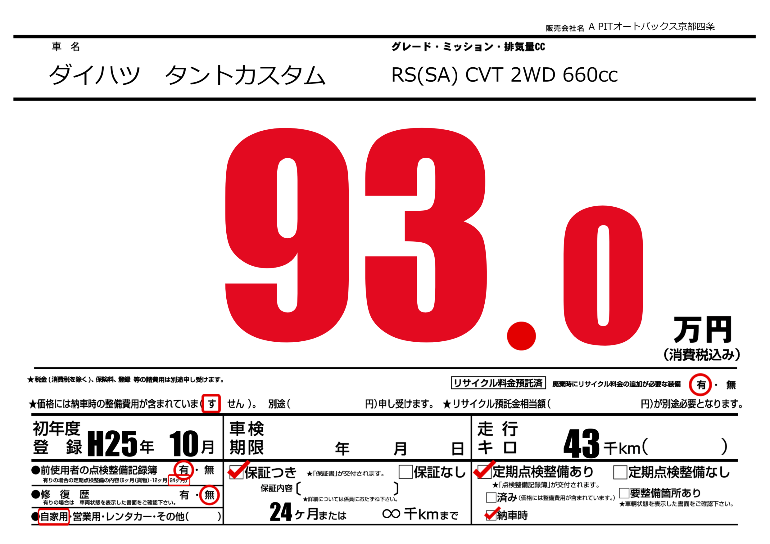 保証なし 保証内容(---) 24ヶ月または(∞)千kmまで |