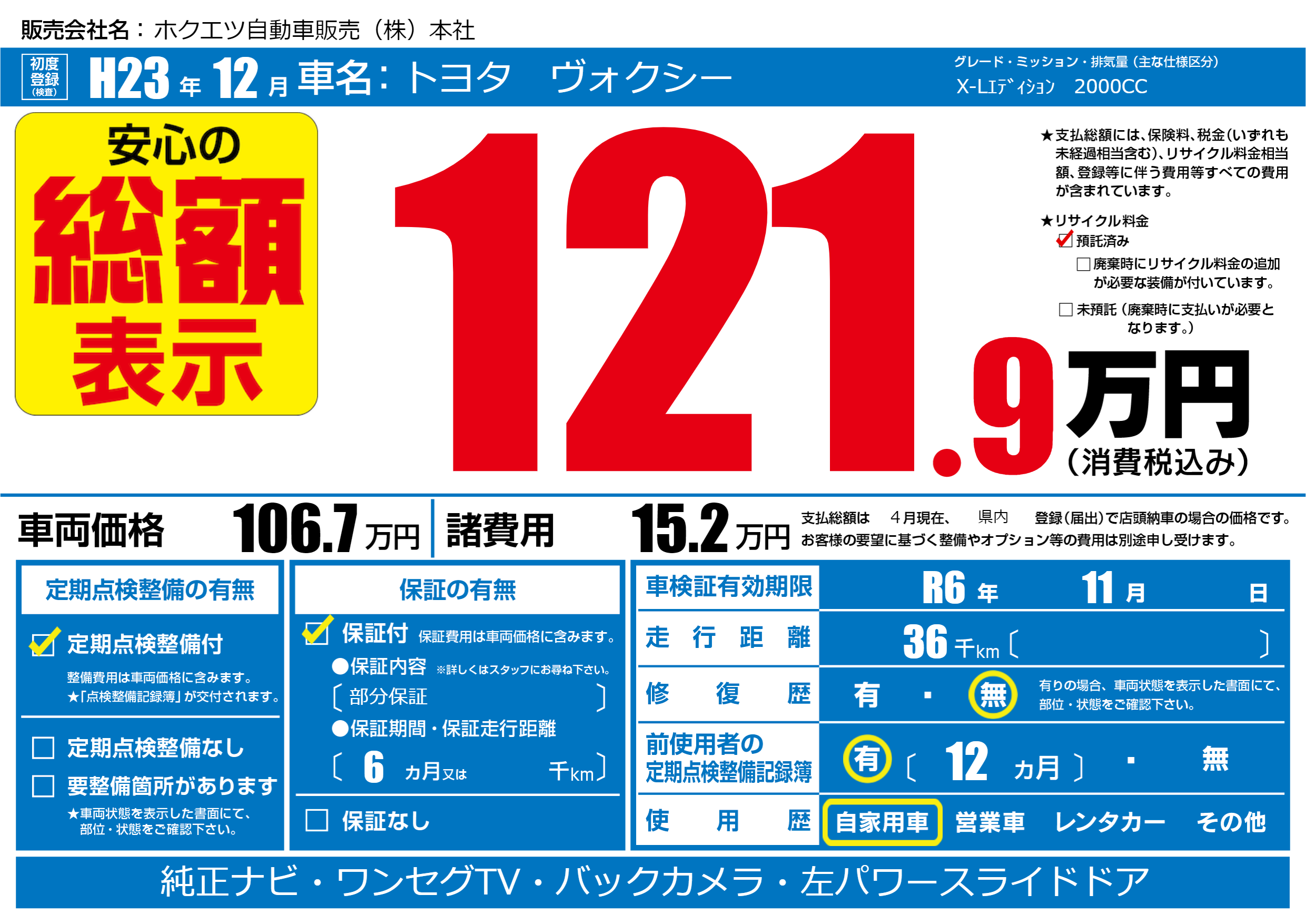| 走行キロ | 3.6万km | 初年度登録 | H23年12月 |