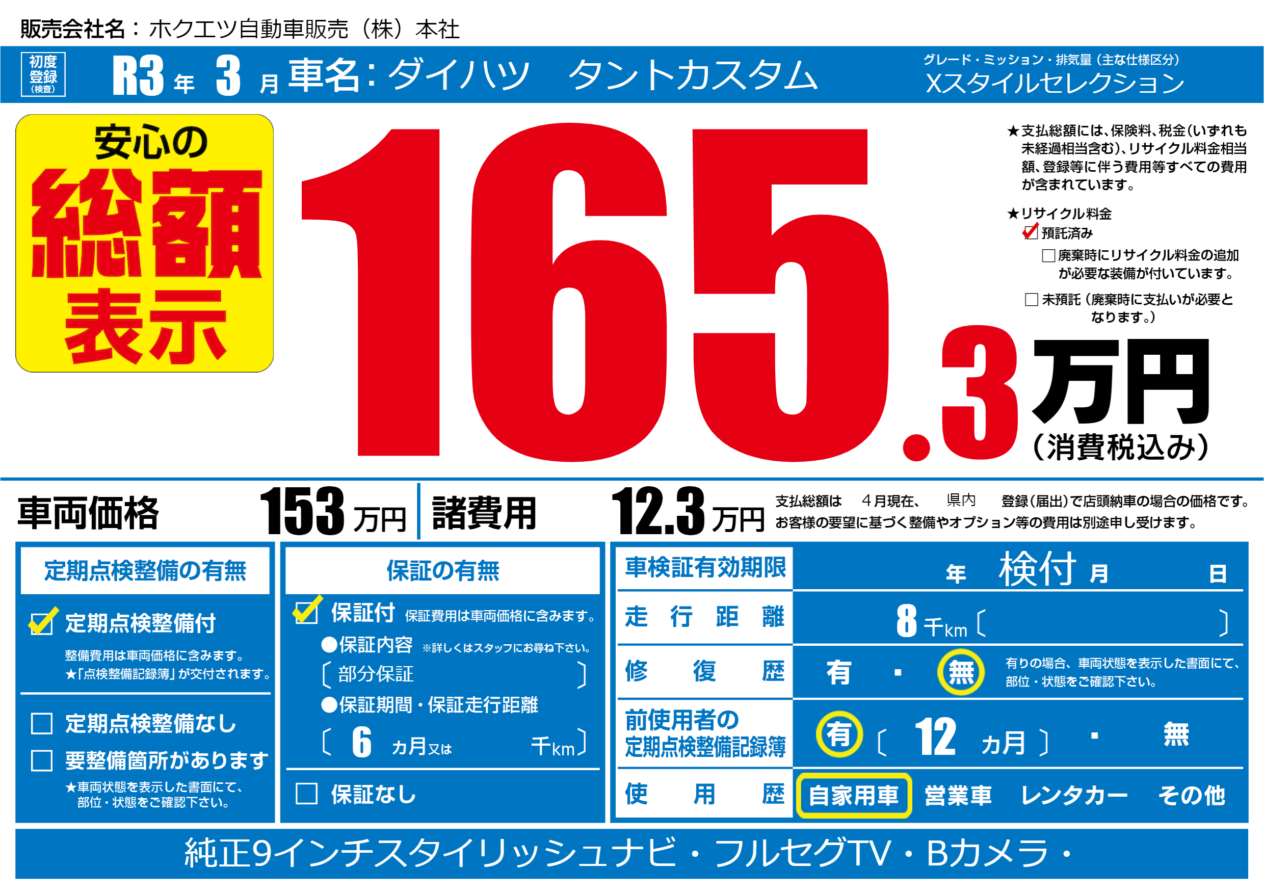 | 走行キロ | 0.8万km | 初年度登録 | R3年3月 |
