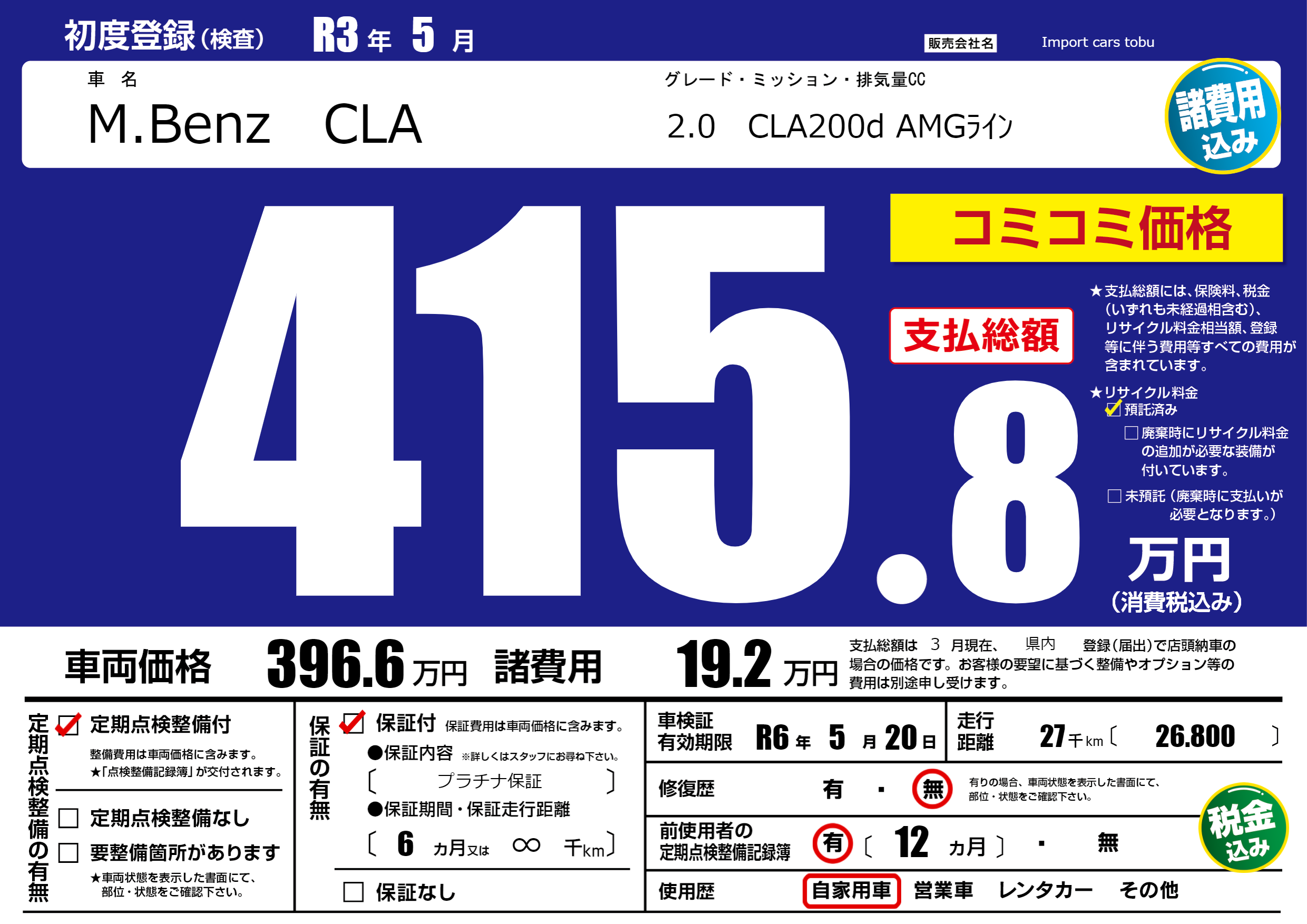 | 車名 | M.Benz CLA | グレード ミッション 排気量 |