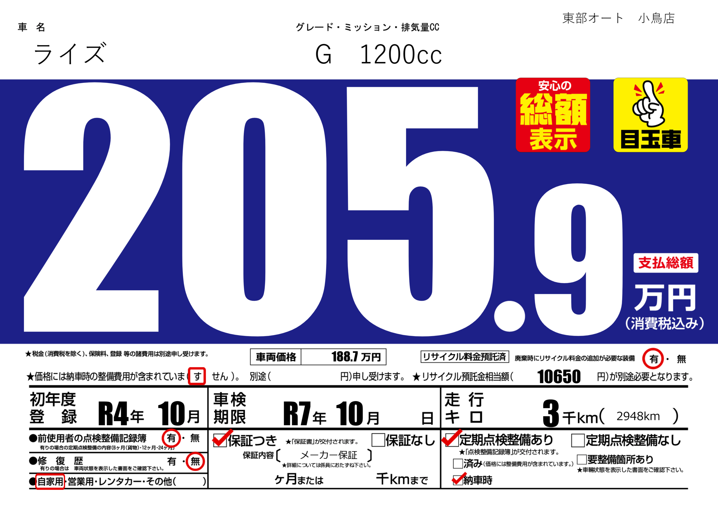 | 車検制限 | R7年 10月 - 日 | ||