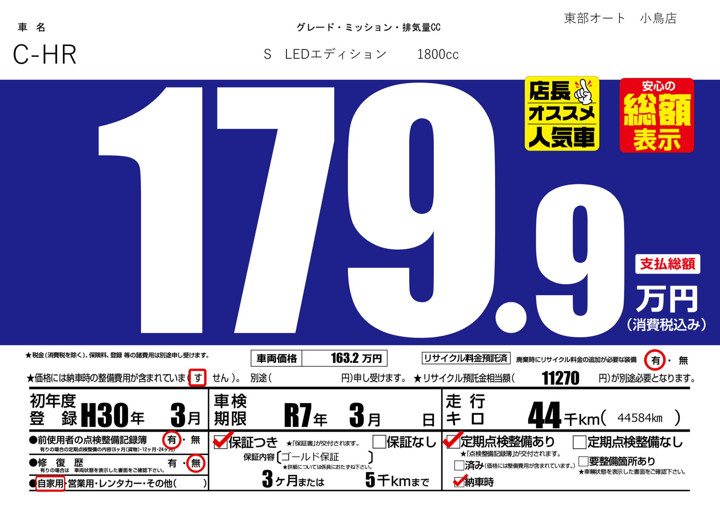 | 車検制限 | R7年 3月 - 日 | ||
