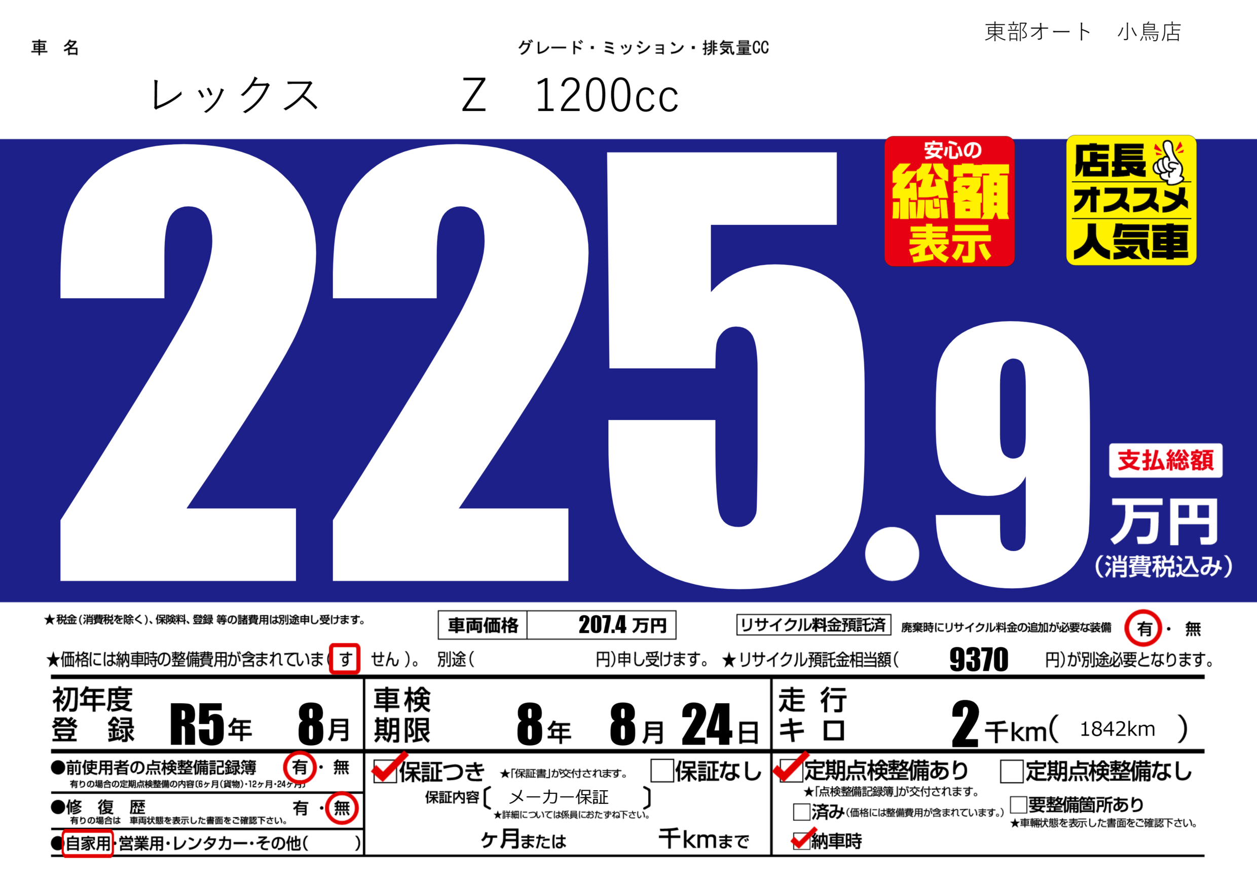 | 走行キロ | 0.2万km | 初年度登録 | R5年8月 |