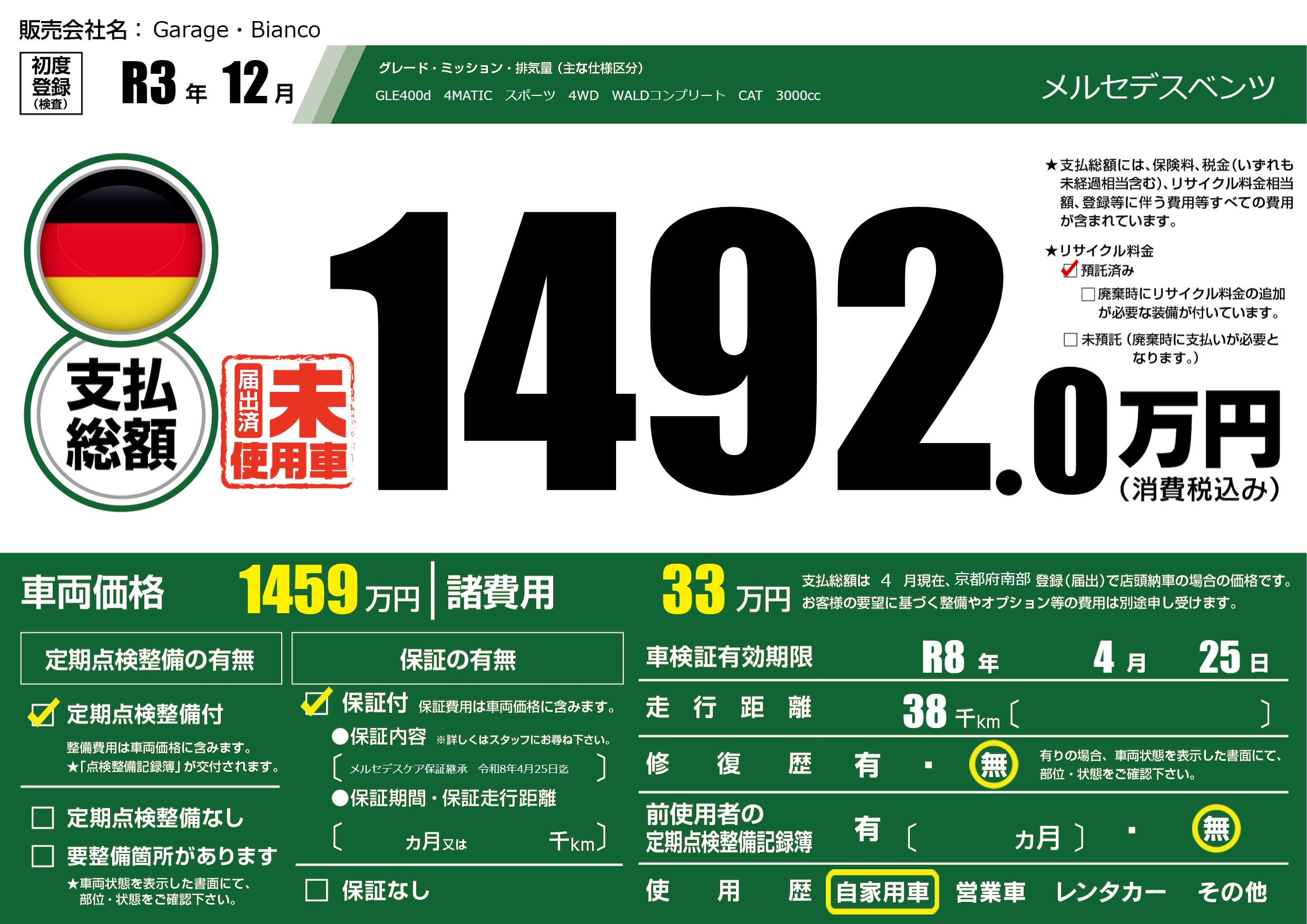 保証付き 保証内容(メルセデスケア保証継承 令和8年4月25日迄) ---ヶ月または()千kmまで |