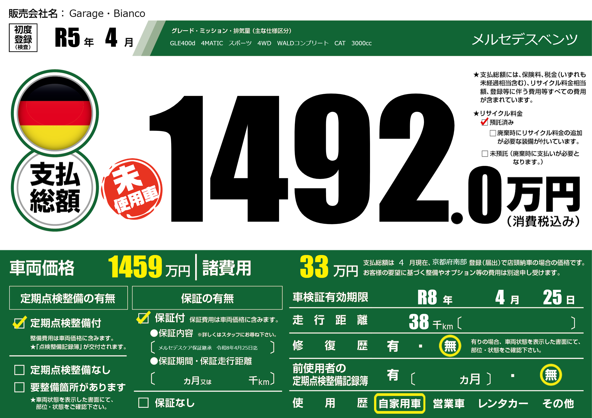 保証付き 保証内容(メルセデスケア保証継承 令和8年4月25日迄) ---ヶ月または()千kmまで |