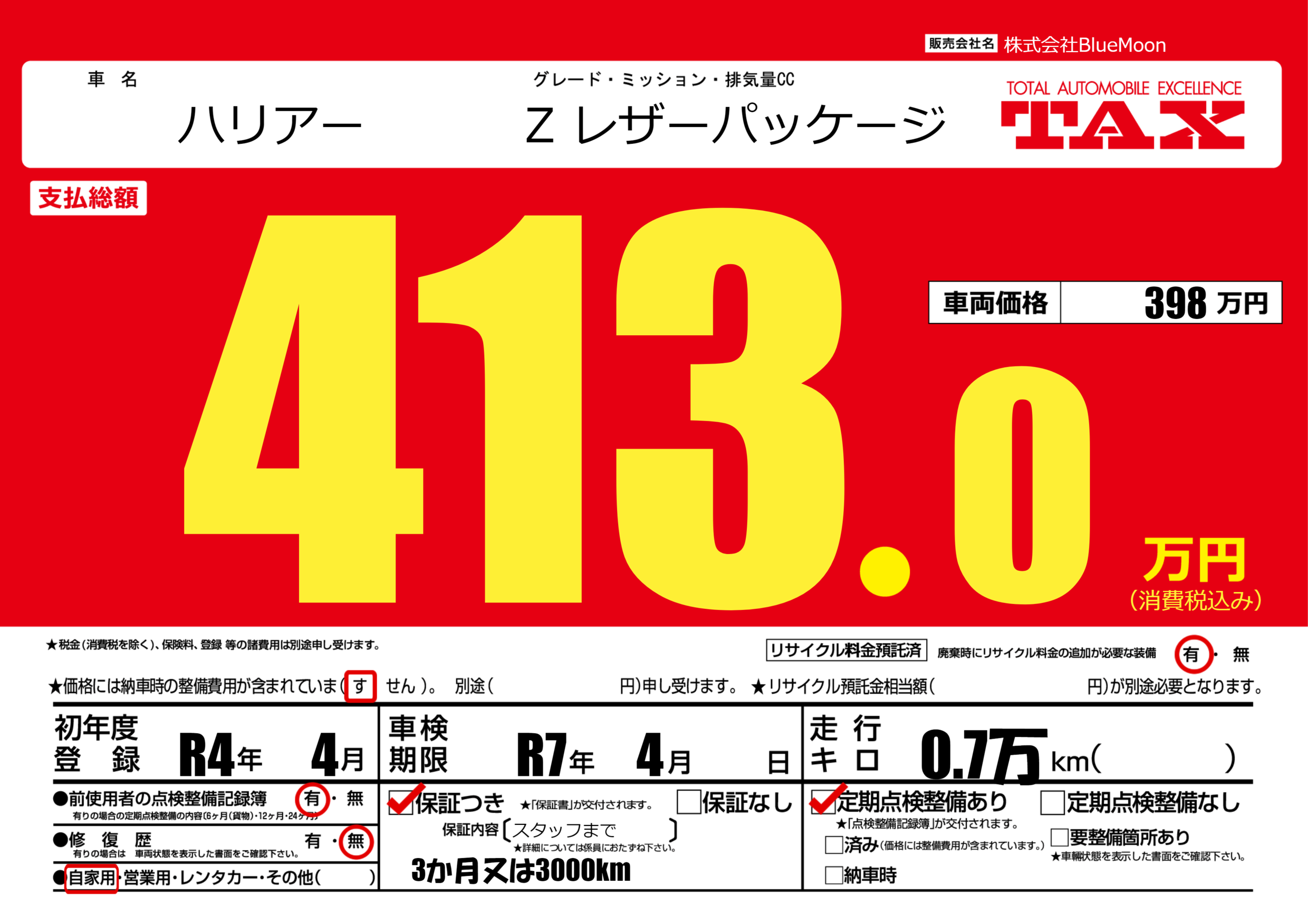 あり | 車検制限 | R7年4月---月 |