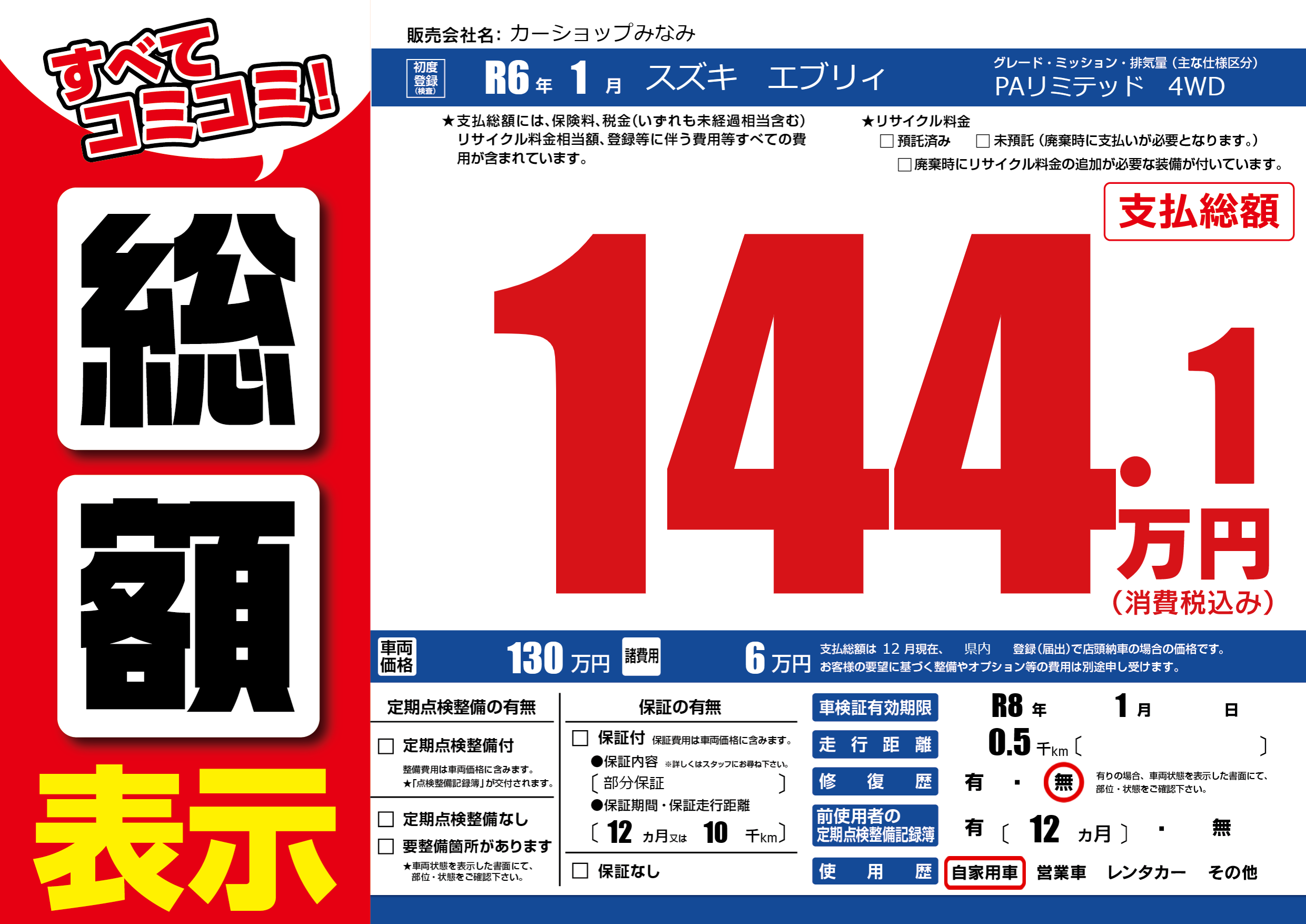 | 車検制限 | R8年 1月 - 日 | ||