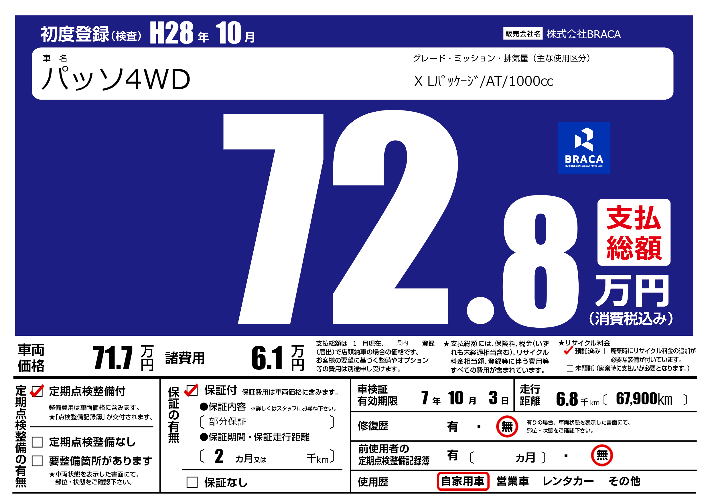 | 車名 | パッソ4WD | グレード ミッション 排気量 |