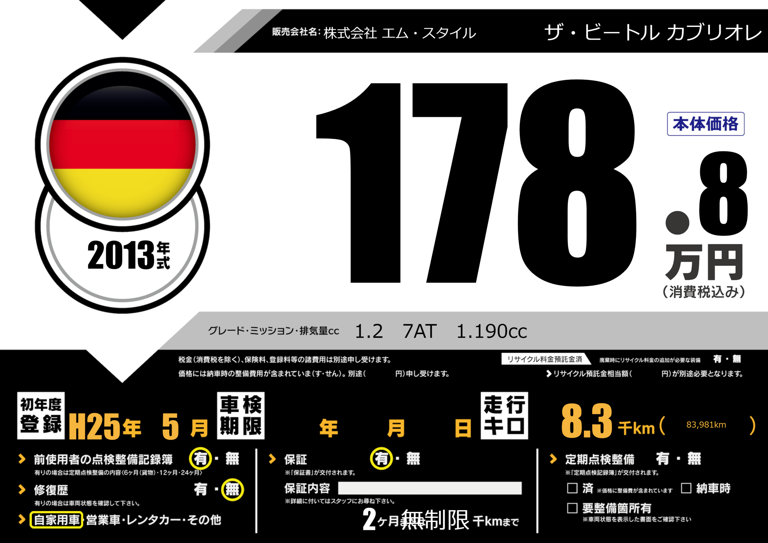 | 車名 | ザ・ビートル カブリオレ | グレード ミッション 排気量 |