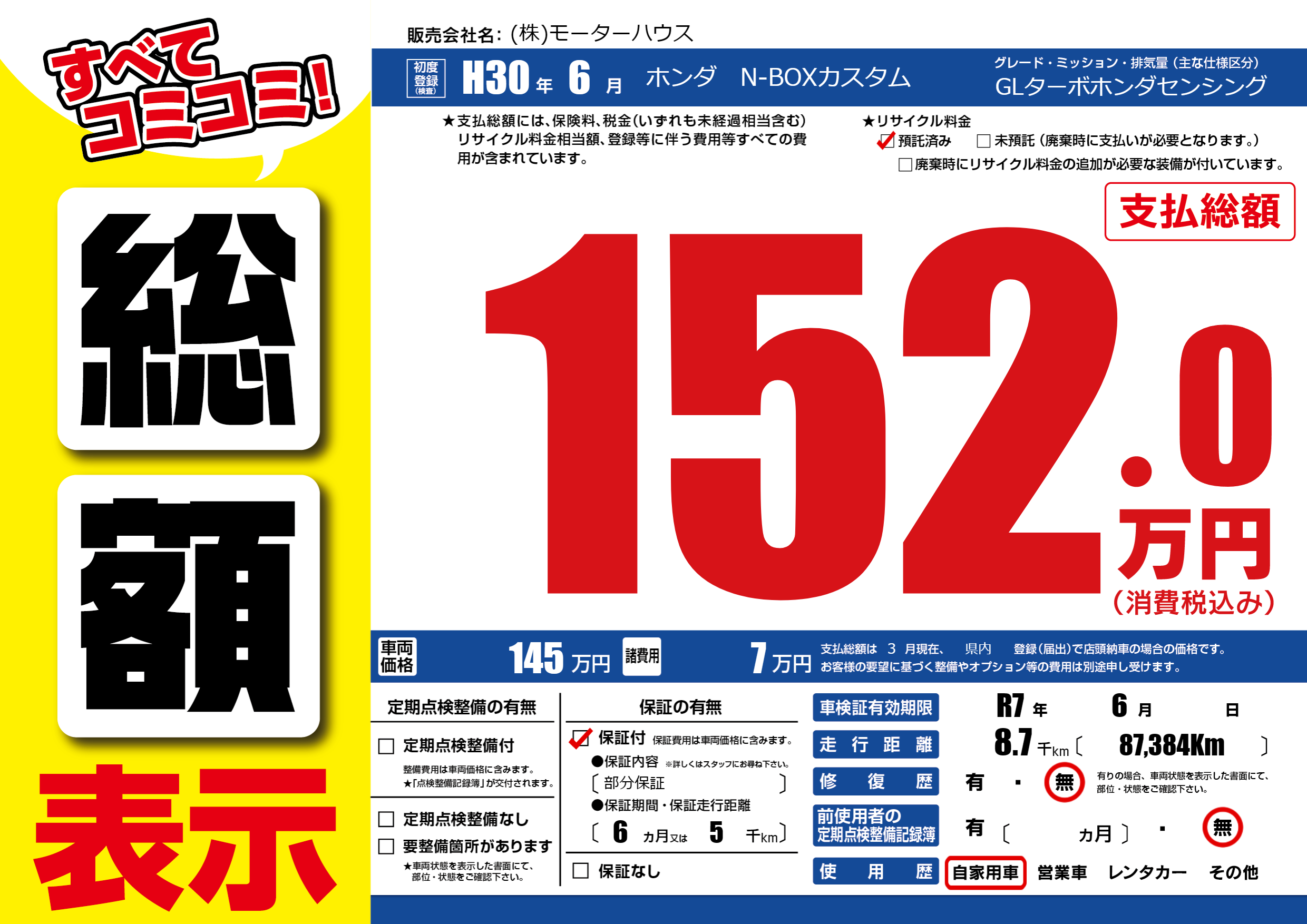 | 走行キロ | 0.8万km | 初年度登録 | H30年6月 |