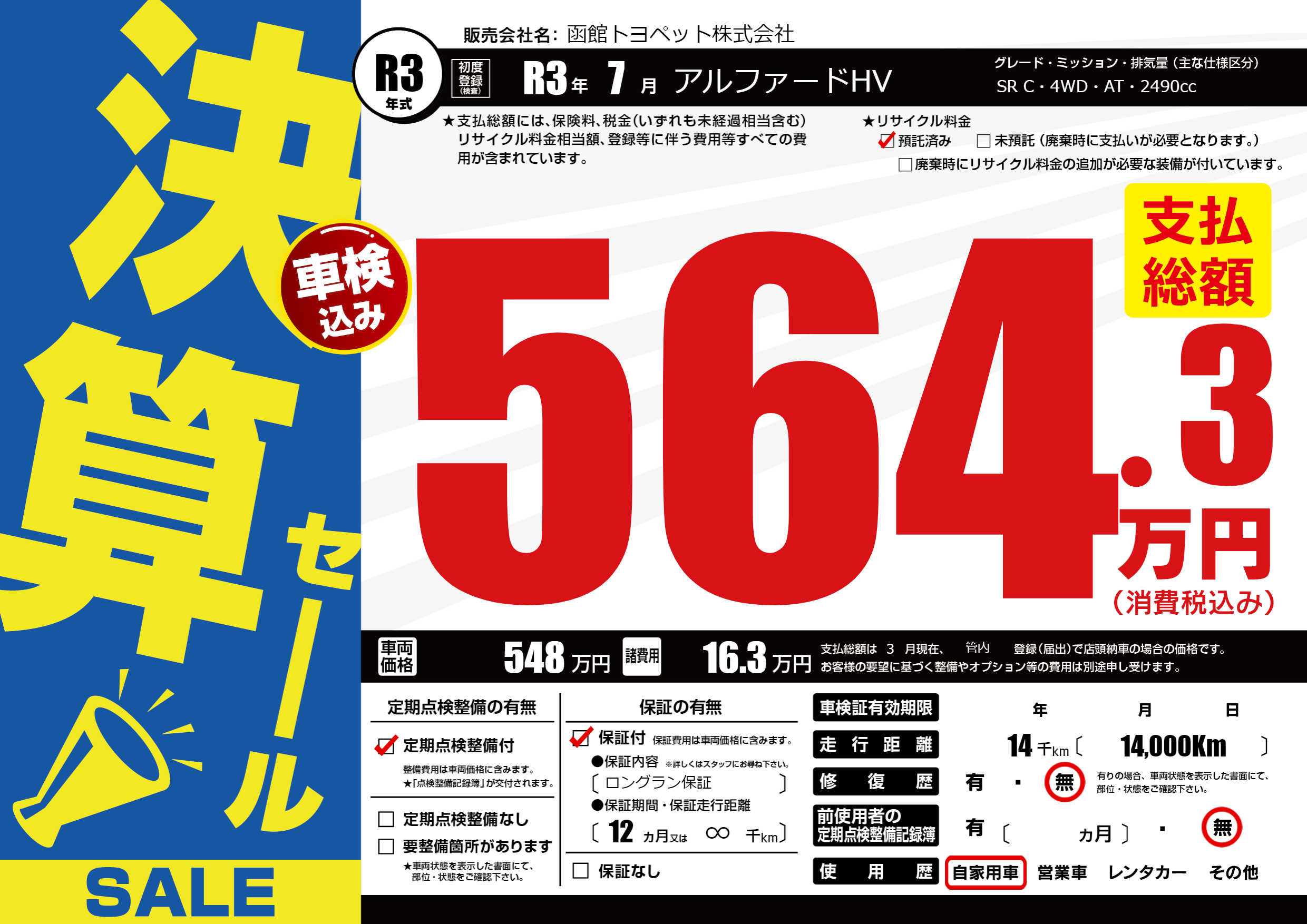 | 走行キロ | 1.4万km | 初年度登録 | R3年7月 |