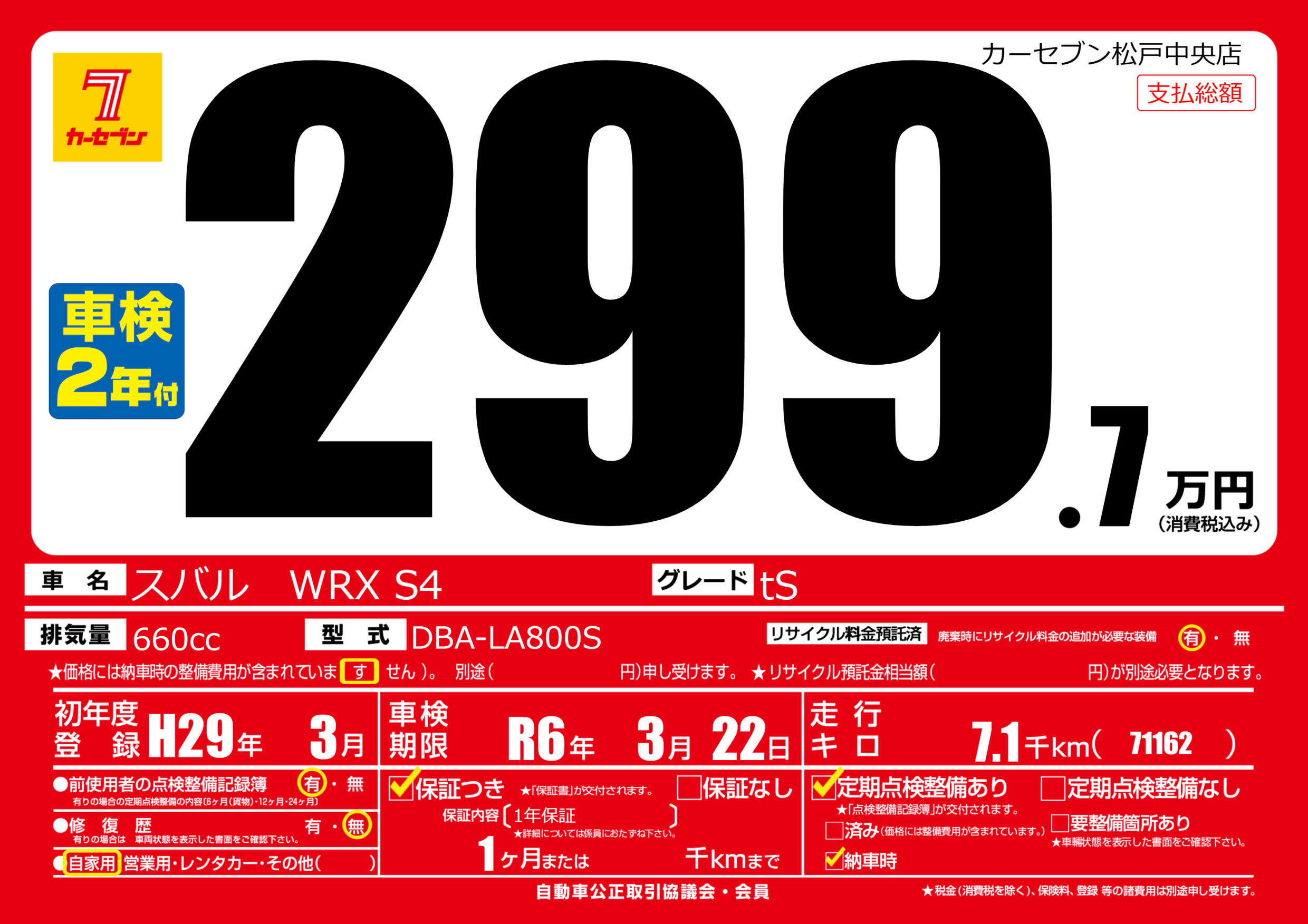 | 車名 | スバル WRX S4 | グレード ミッション 排気量 |