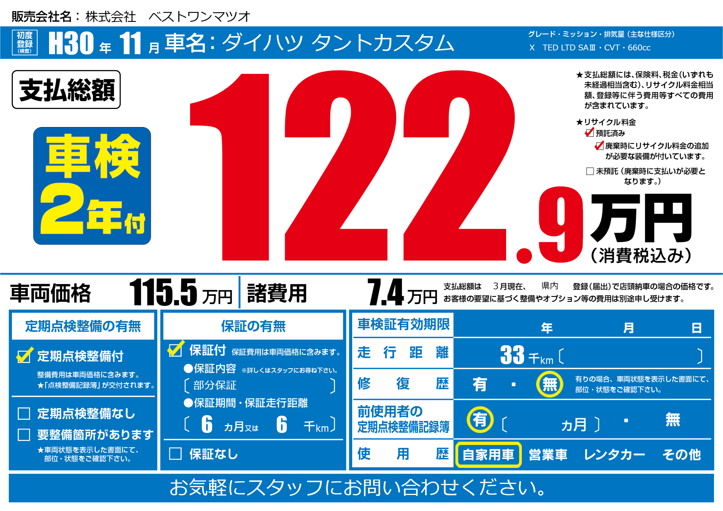 | 走行キロ | 3.3万km | 初年度登録 | H30年11月 |