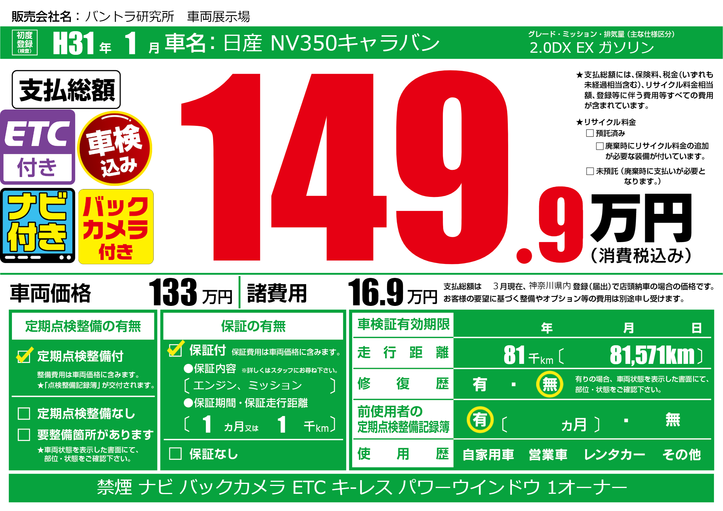 | 車名 | 日産 NV350キャラバン | グレード ミッション 排気量 |