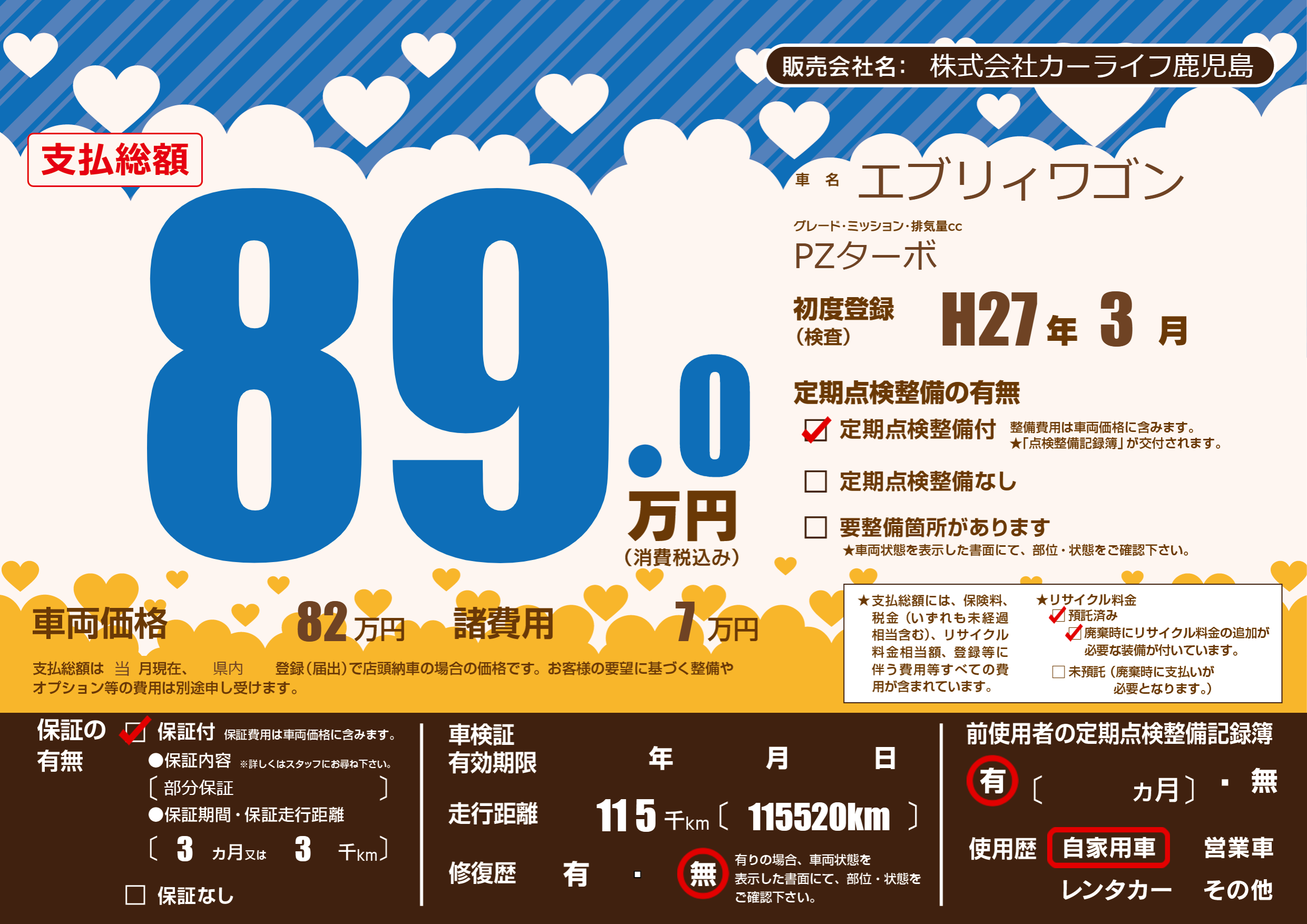 | 車名 | エブリィワゴン | グレード ミッション 排気量 |