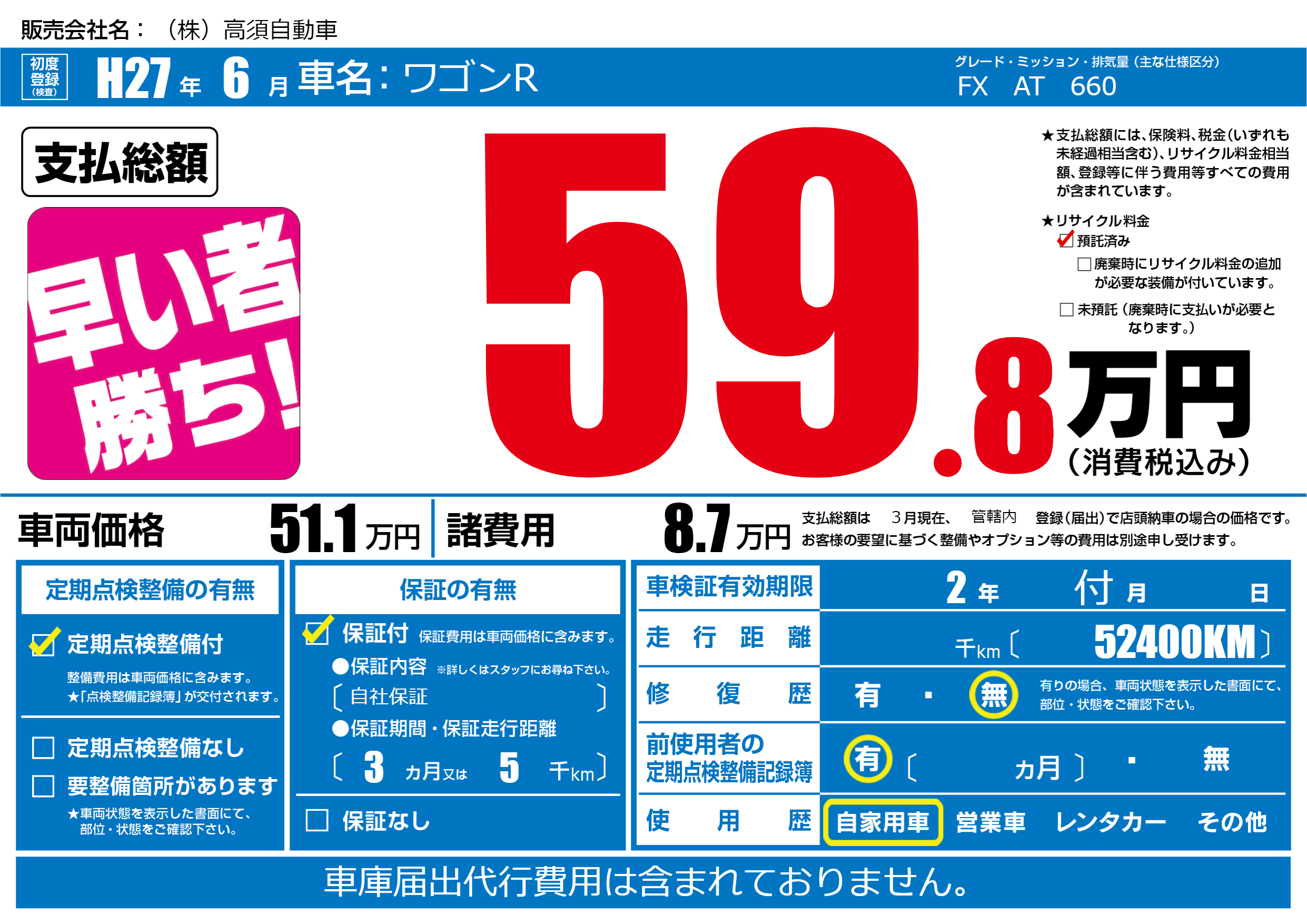 | 車名 | ワゴンR | グレード ミッション 排気量 |