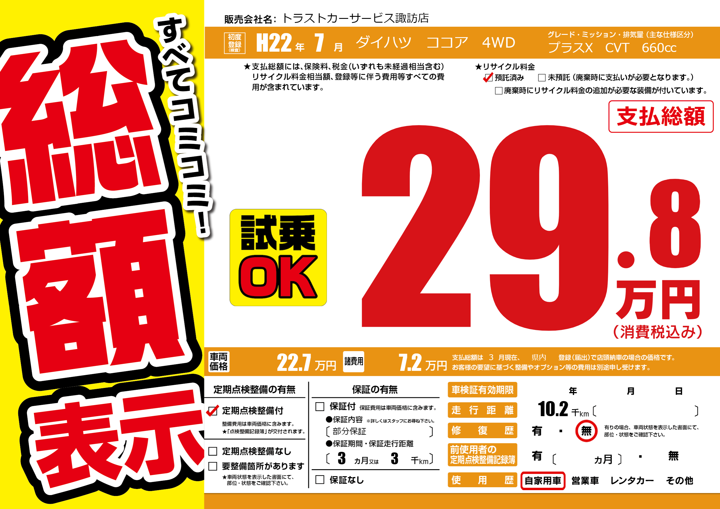 | 車名 | ダイハツ ココア 4WD | グレード ミッション 排気量 |