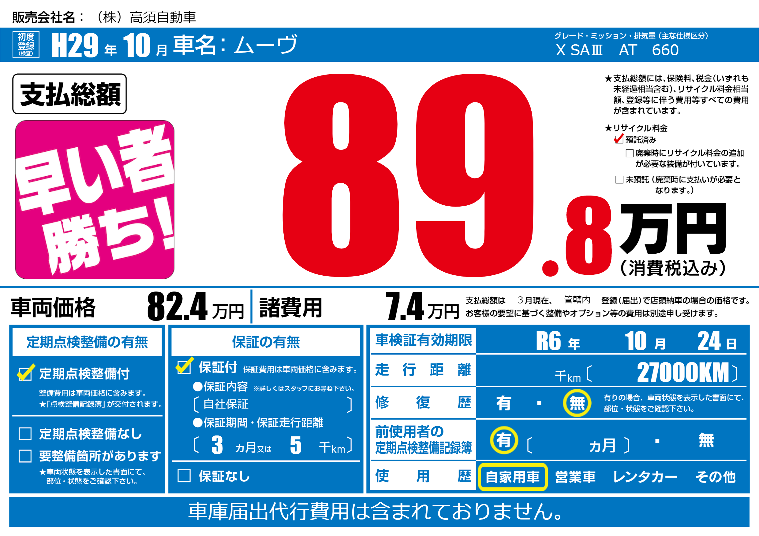| 車名 | ムーヴ | グレード ミッション 排気量 |