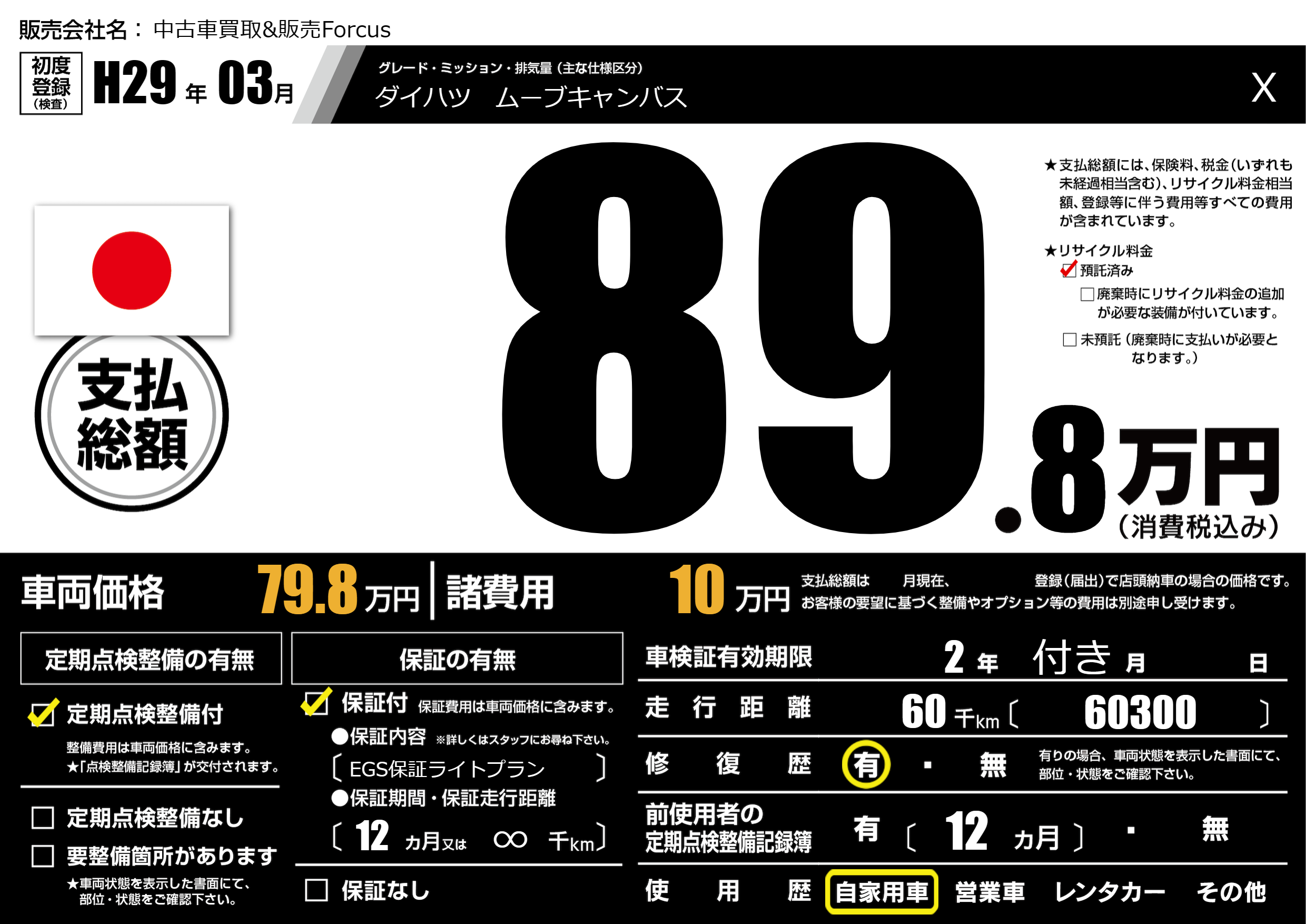 | 走行キロ | 6万km | 初年度登録 | H29年03月 |