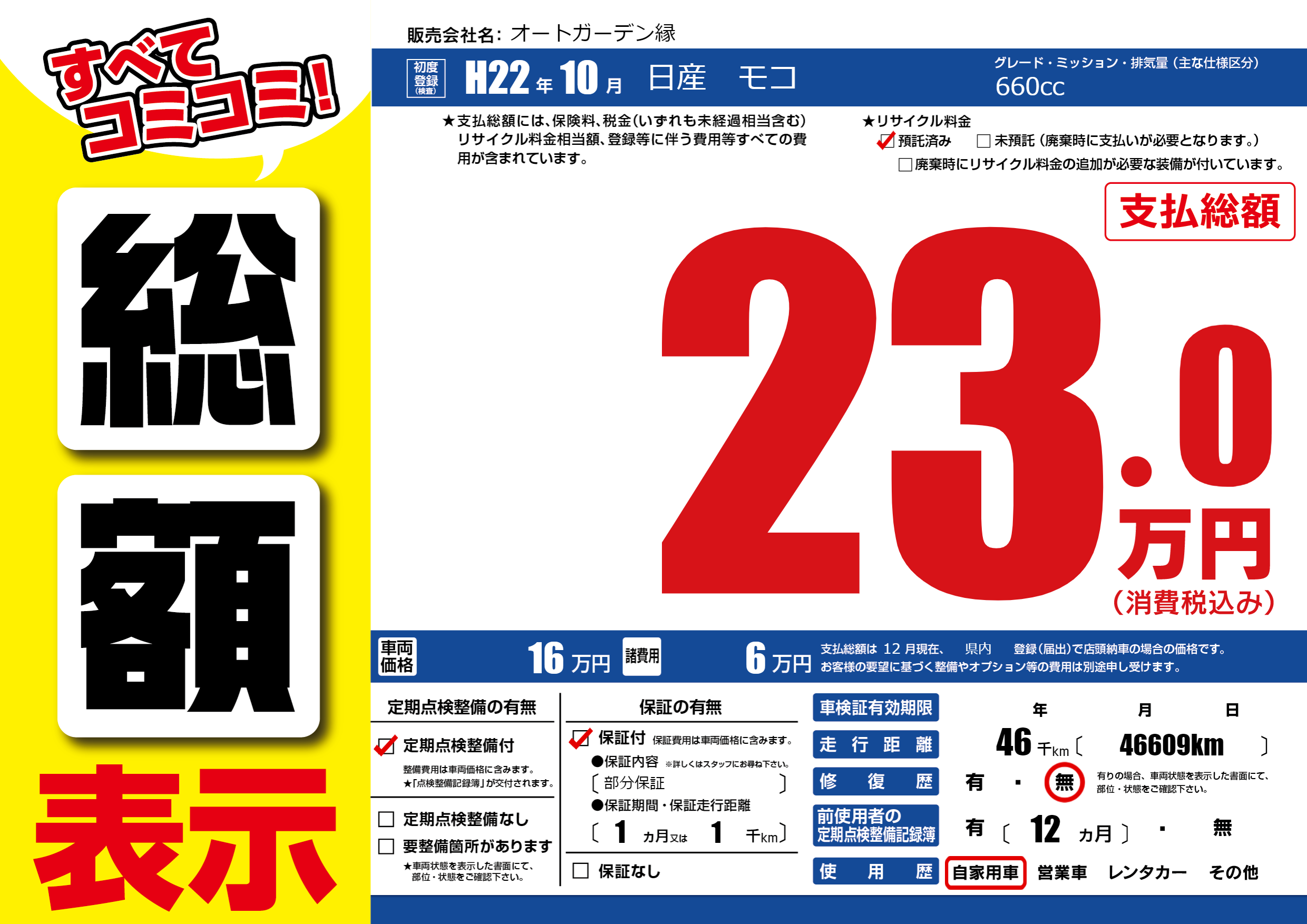 | 車名 | 日産 モコ | グレード ミッション 排気量 |