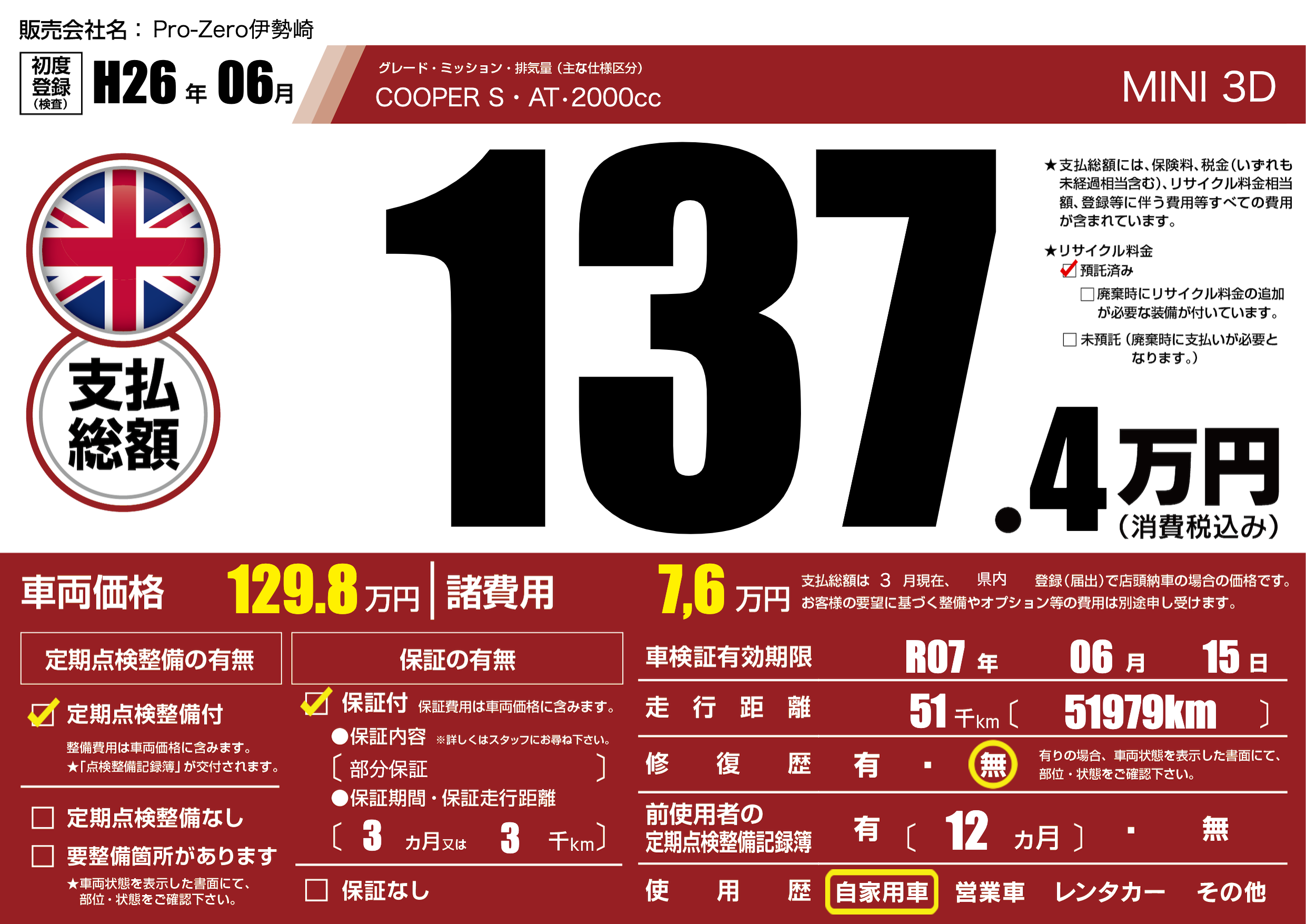 | 走行キロ | 5.1万km | 初年度登録 | H26年06月 |