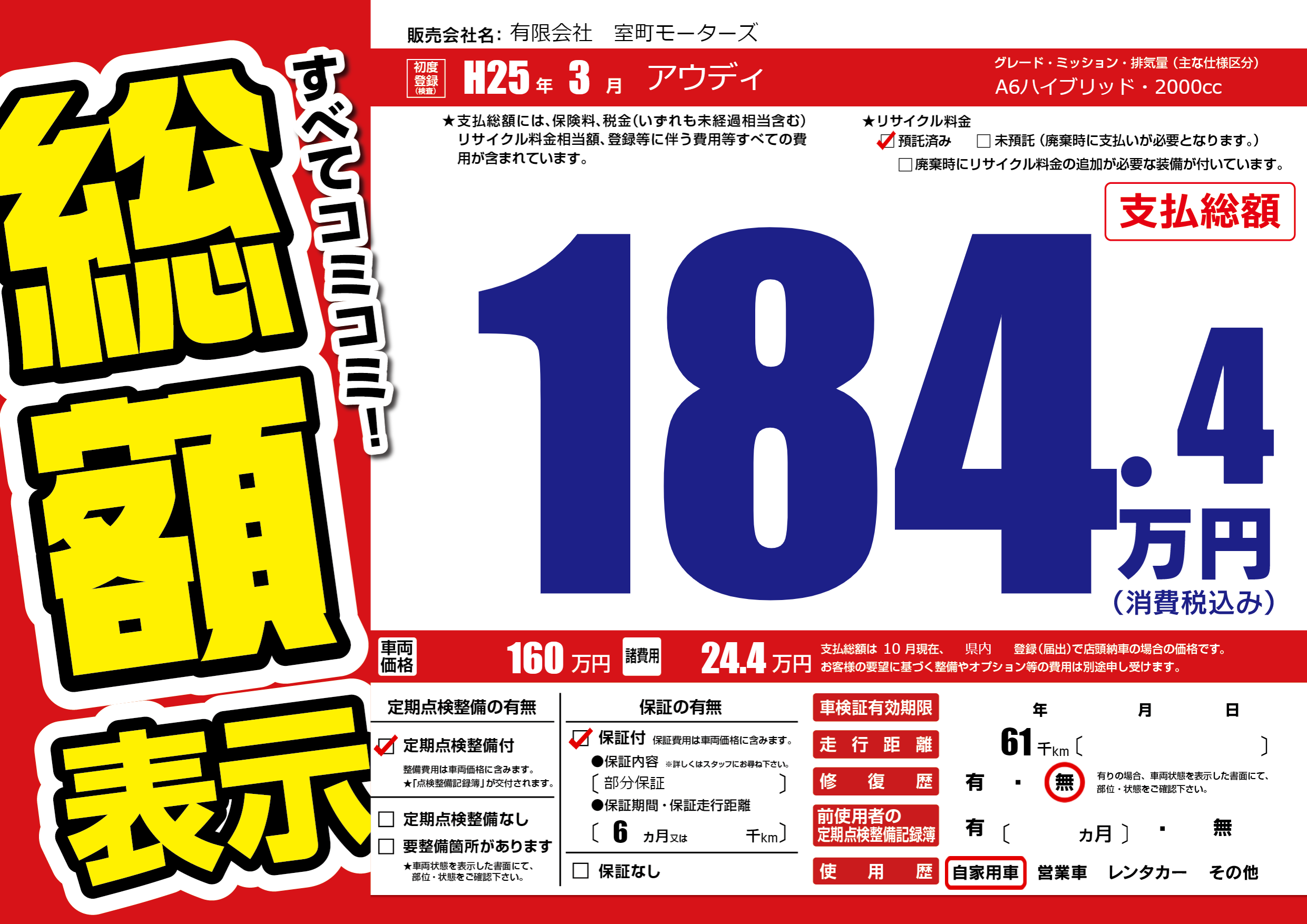 | 車名 | アウディ | グレード ミッション 排気量 |