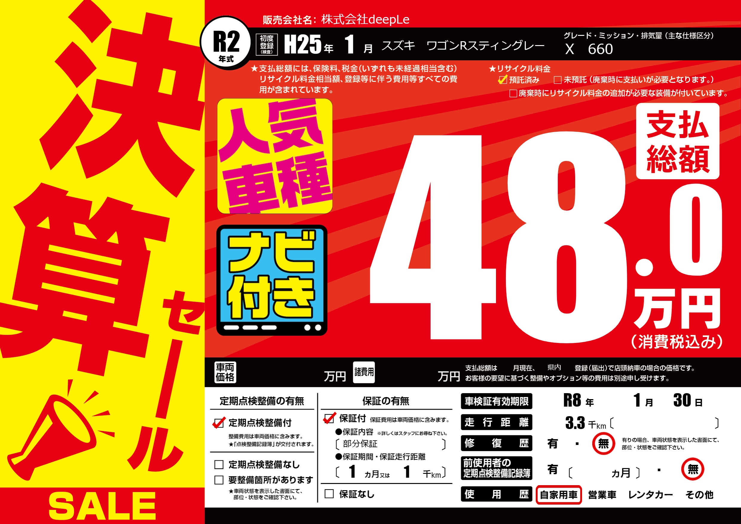 | 走行キロ | 0.3万km | 初年度登録 | H25年1月 |