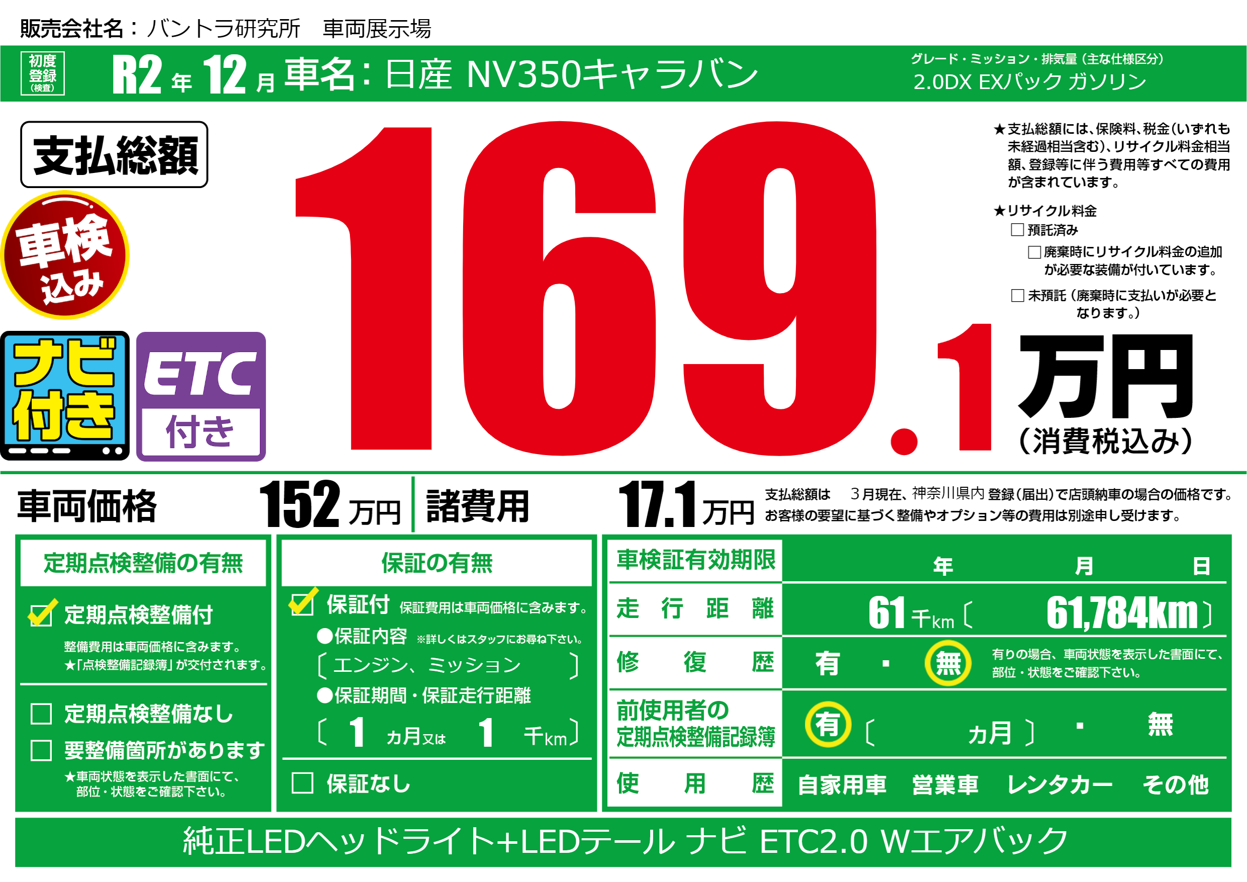 | 車名 | 日産 NV350キャラバン | グレード ミッション 排気量 |