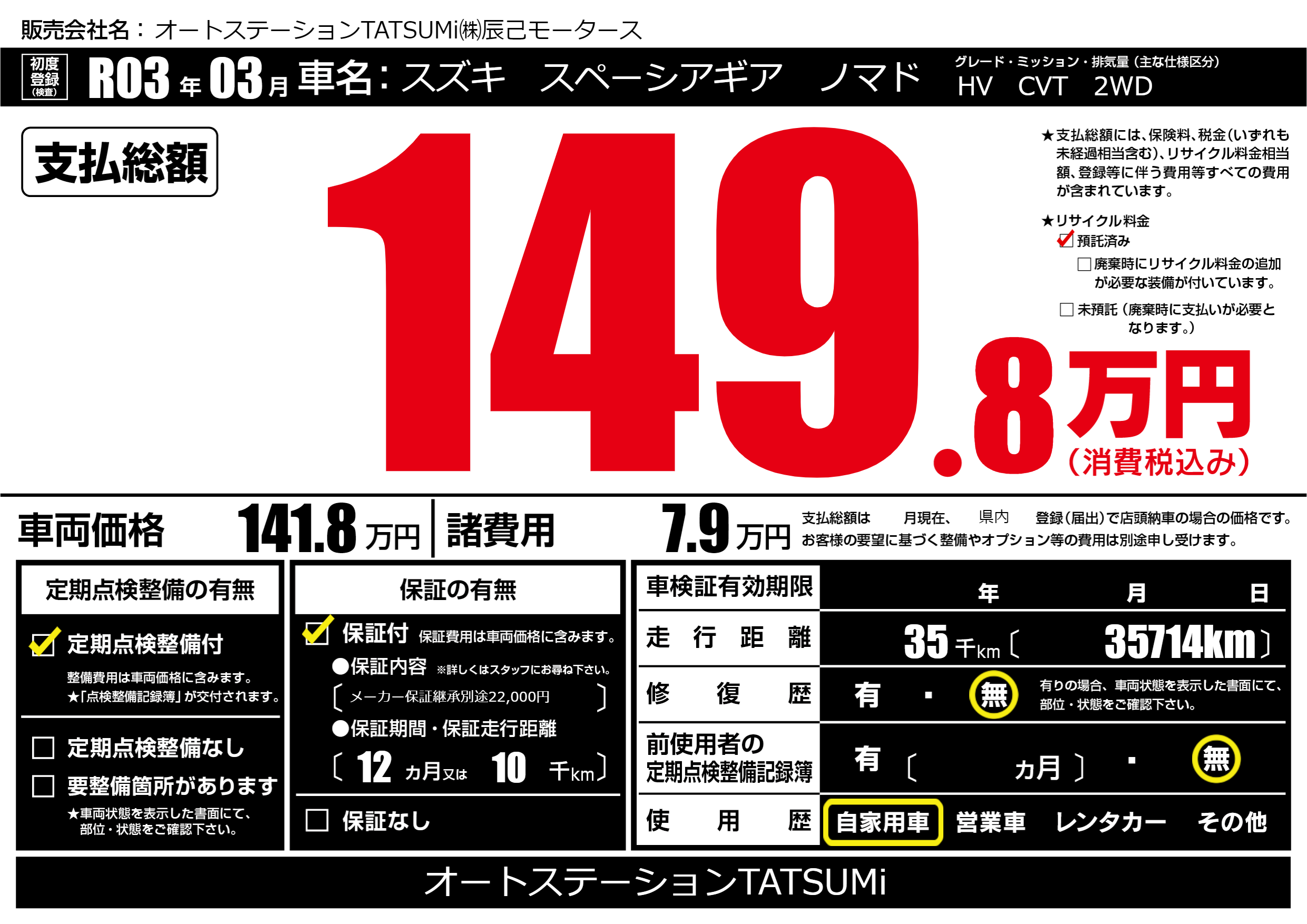 | 走行キロ | 3.5万km | 初年度登録 | R03年03月 |
