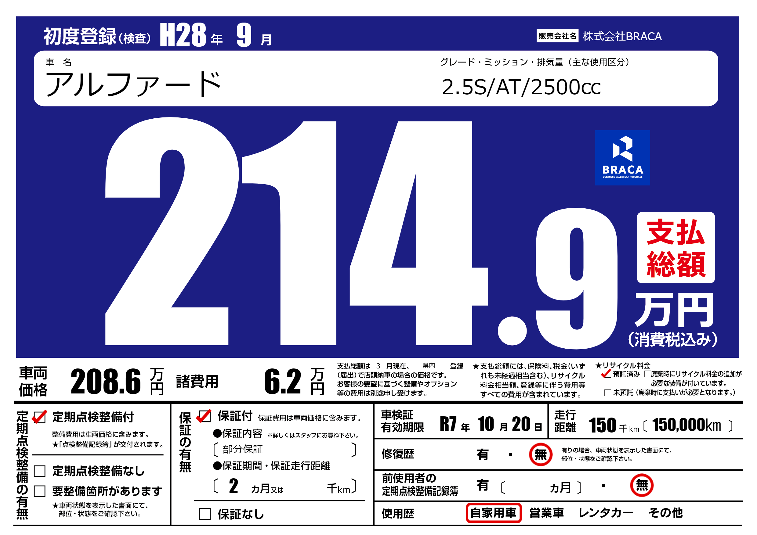 | 走行キロ | 15万km | 初年度登録 | H28年9月 |