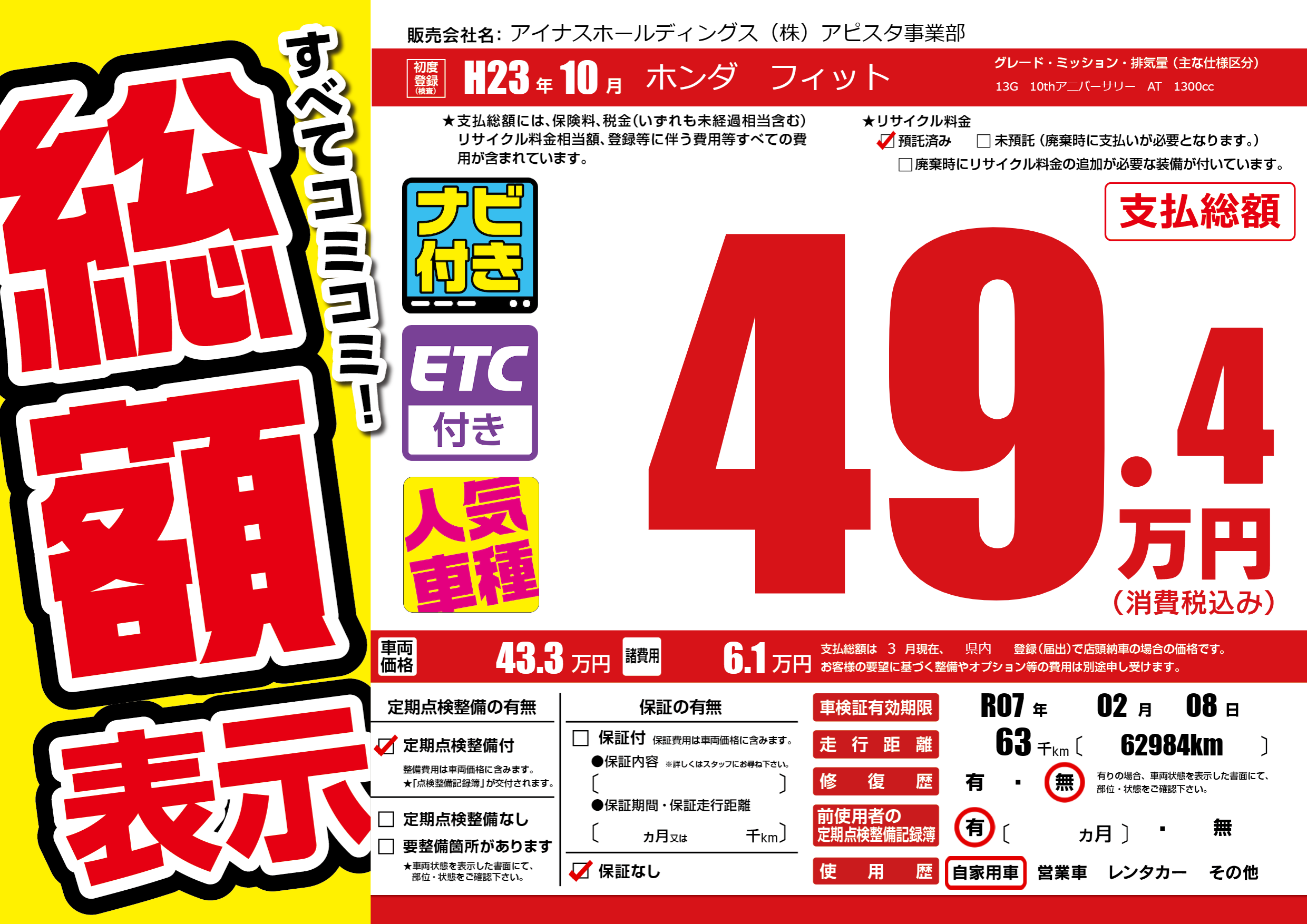 なし | 車検制限 | R07年02月08月 |