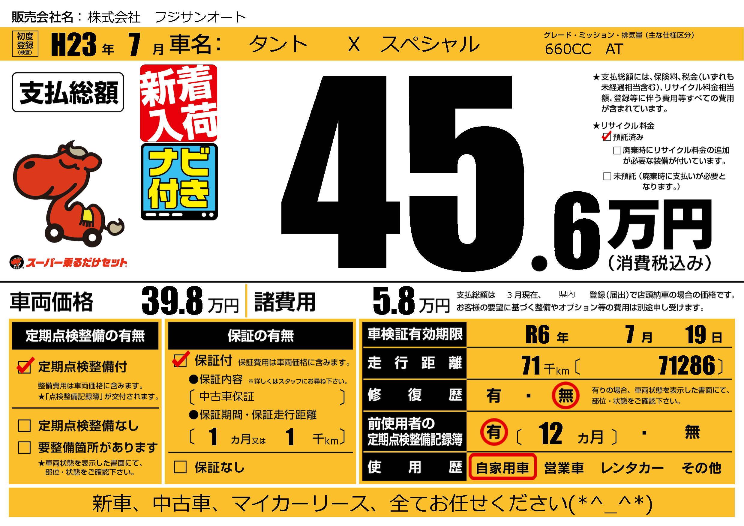 | 車名 | タント X スペシャル | グレード ミッション 排気量 |