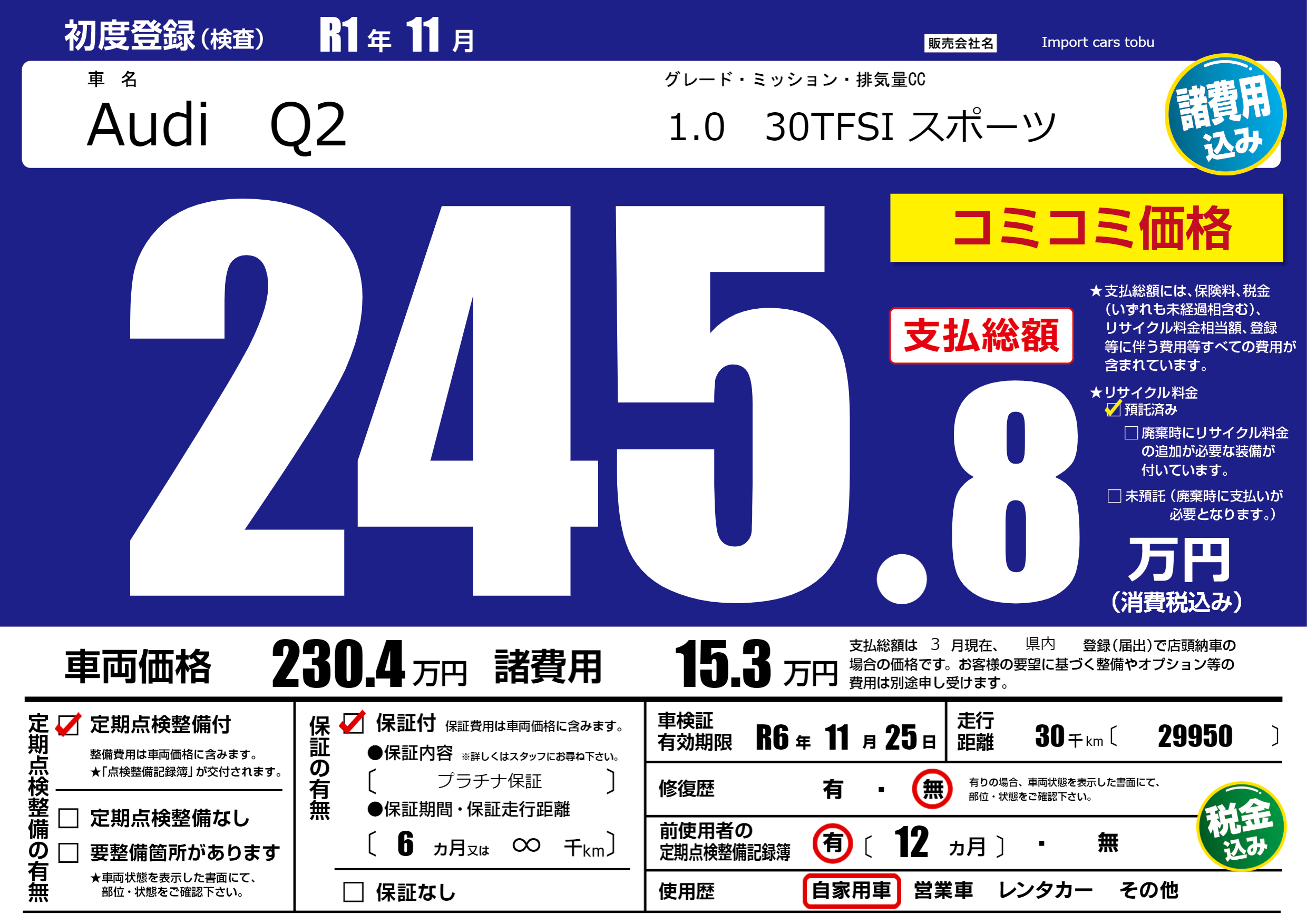 保証付き 保証内容( プラチナ保証) 6ヶ月または(∞)千kmまで |