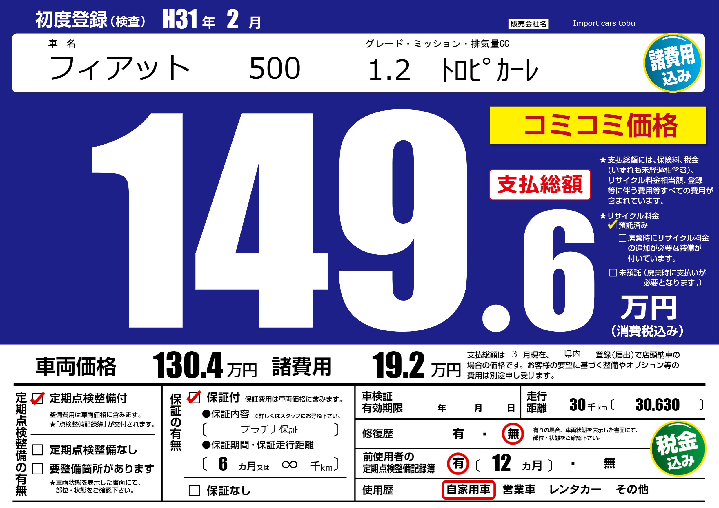 | 車名 | フィアット 500 | グレード ミッション 排気量 |