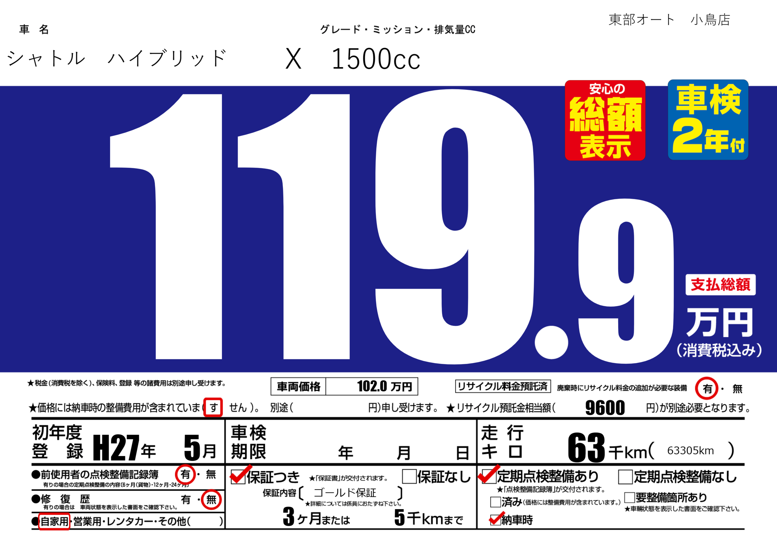 保証付き 保証内容( ゴールド保証) 3ヶ月または5千km |