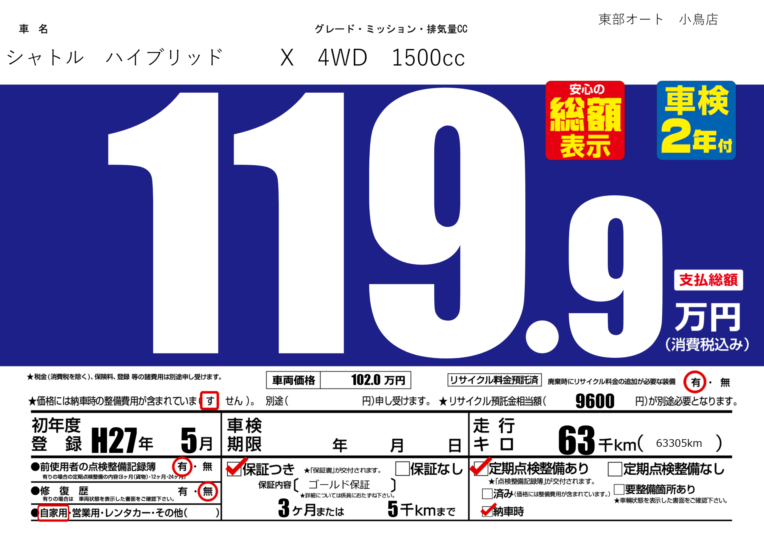 | 車名 | シャトル ハイブリッド | グレード ミッション 排気量 |