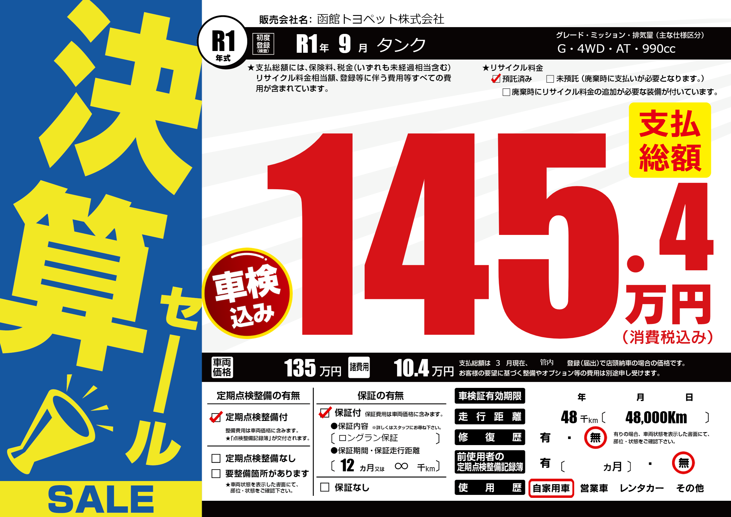 | 走行キロ | 4.8万km | 初年度登録 | R1年9月 |