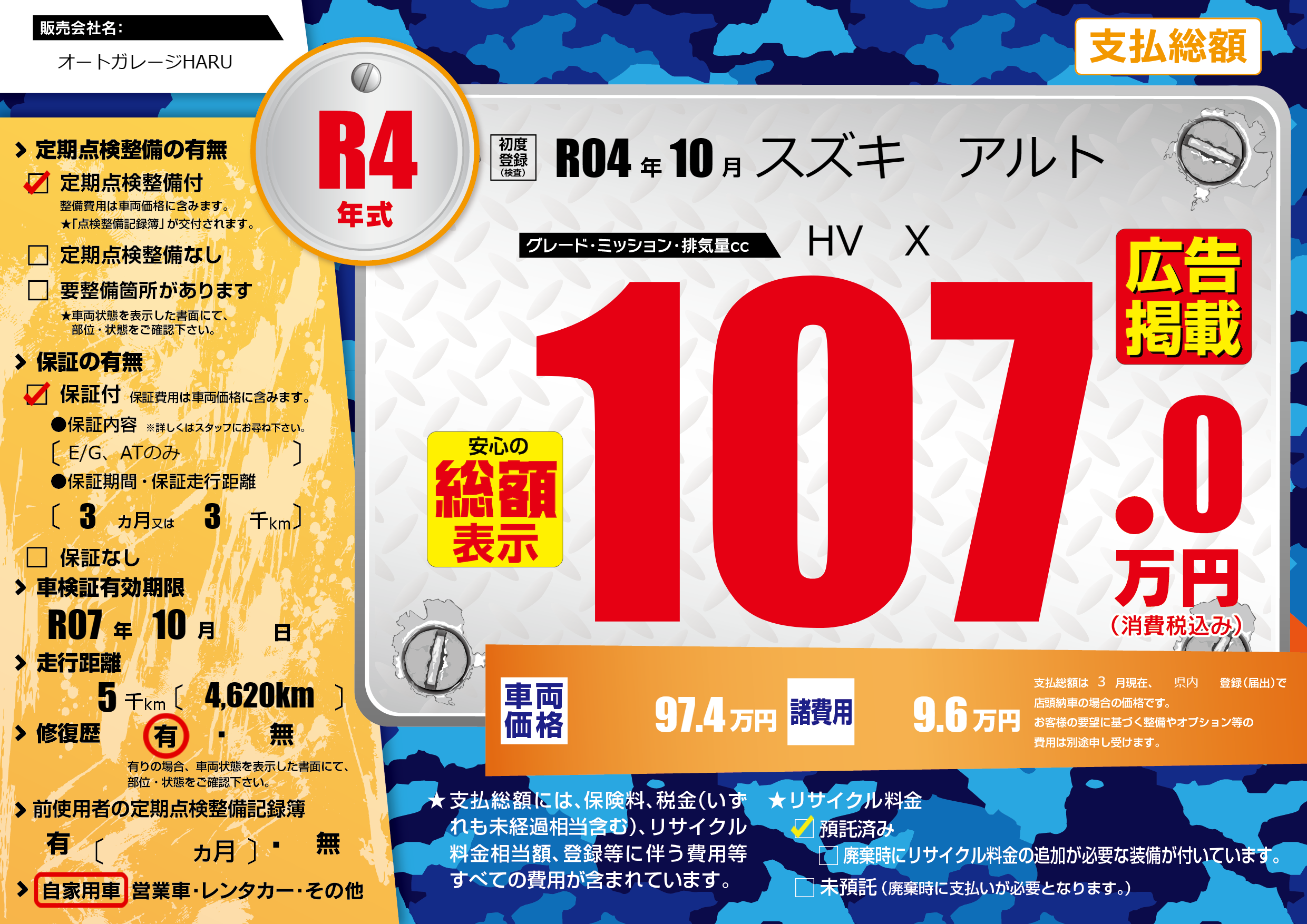 | 車名 | スズキ アルト | グレード ミッション 排気量 |