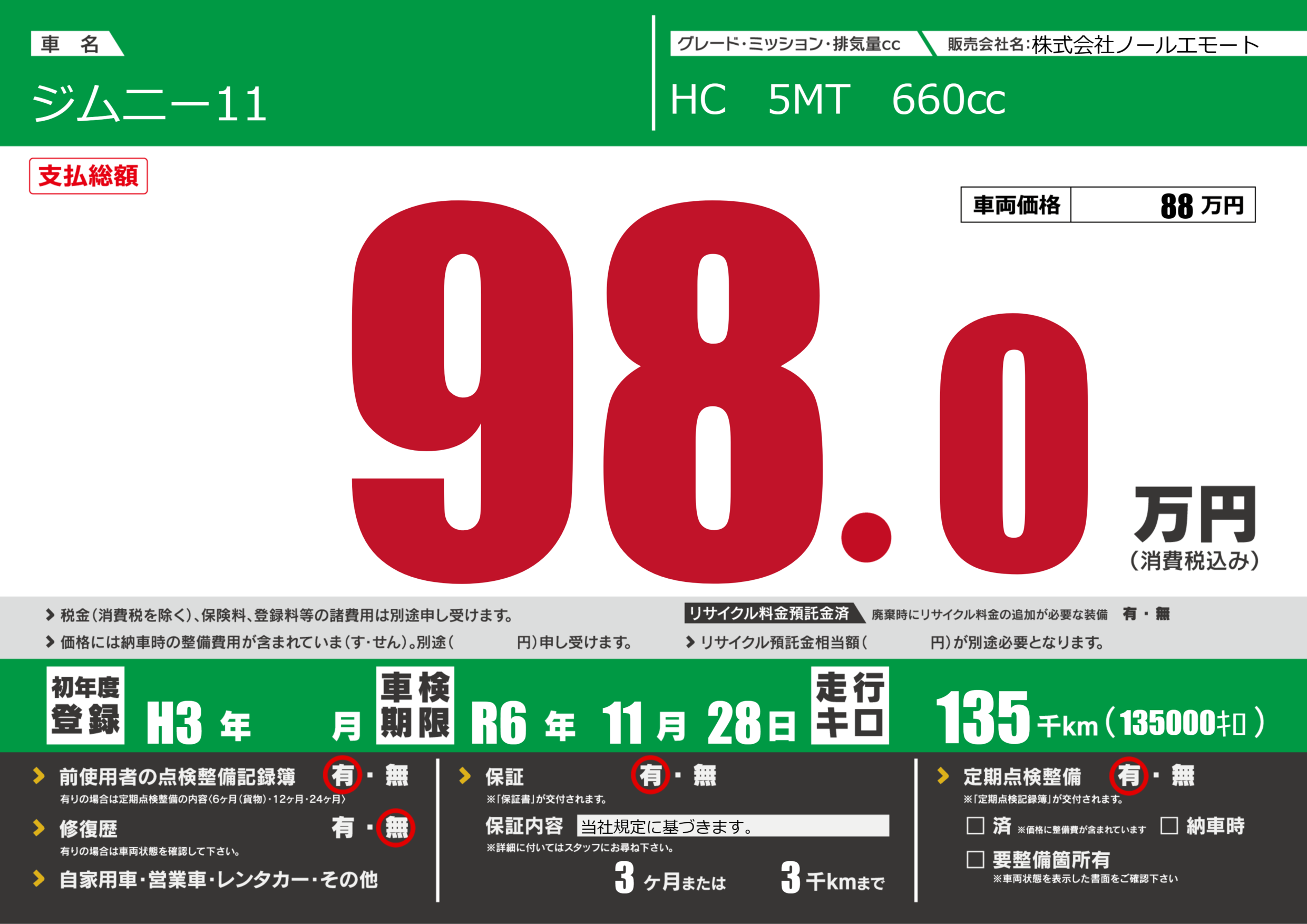 | 車名 | ジムニー11 | グレード ミッション 排気量 |