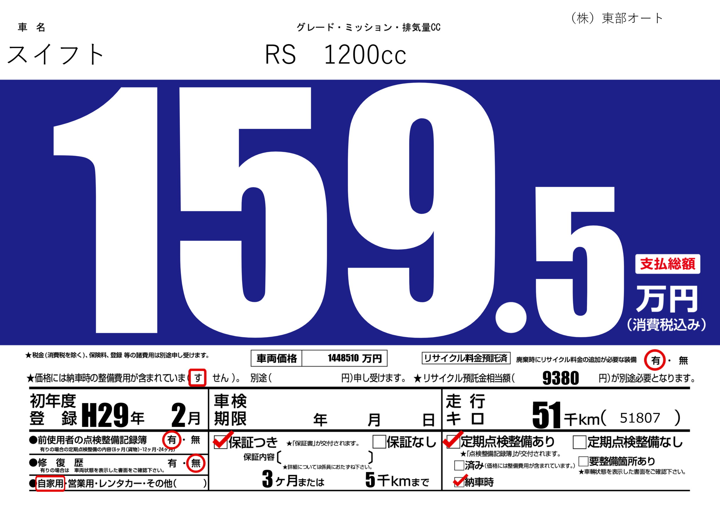 | 車名 | スイフト | グレード ミッション 排気量 |