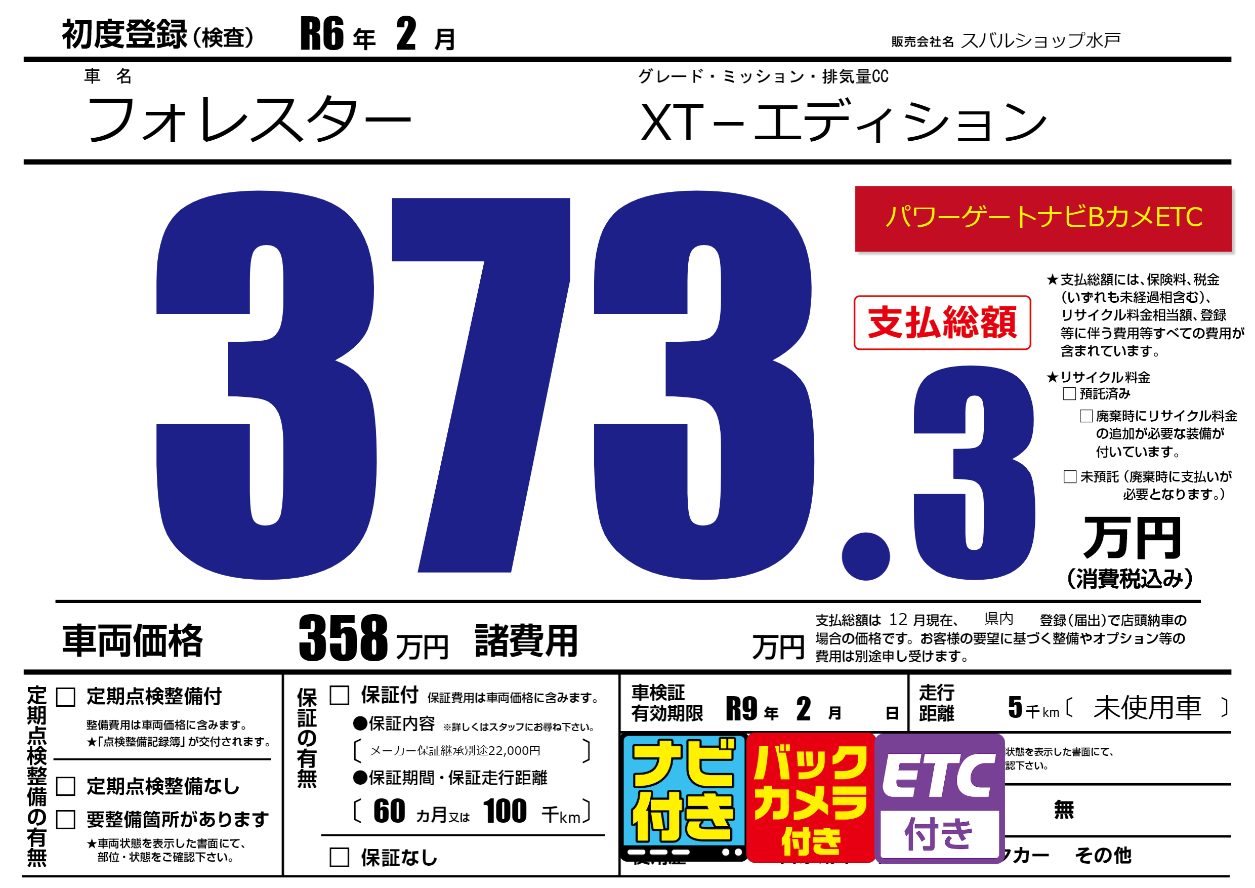| 車名 | フォレスター | グレード ミッション 排気量 |